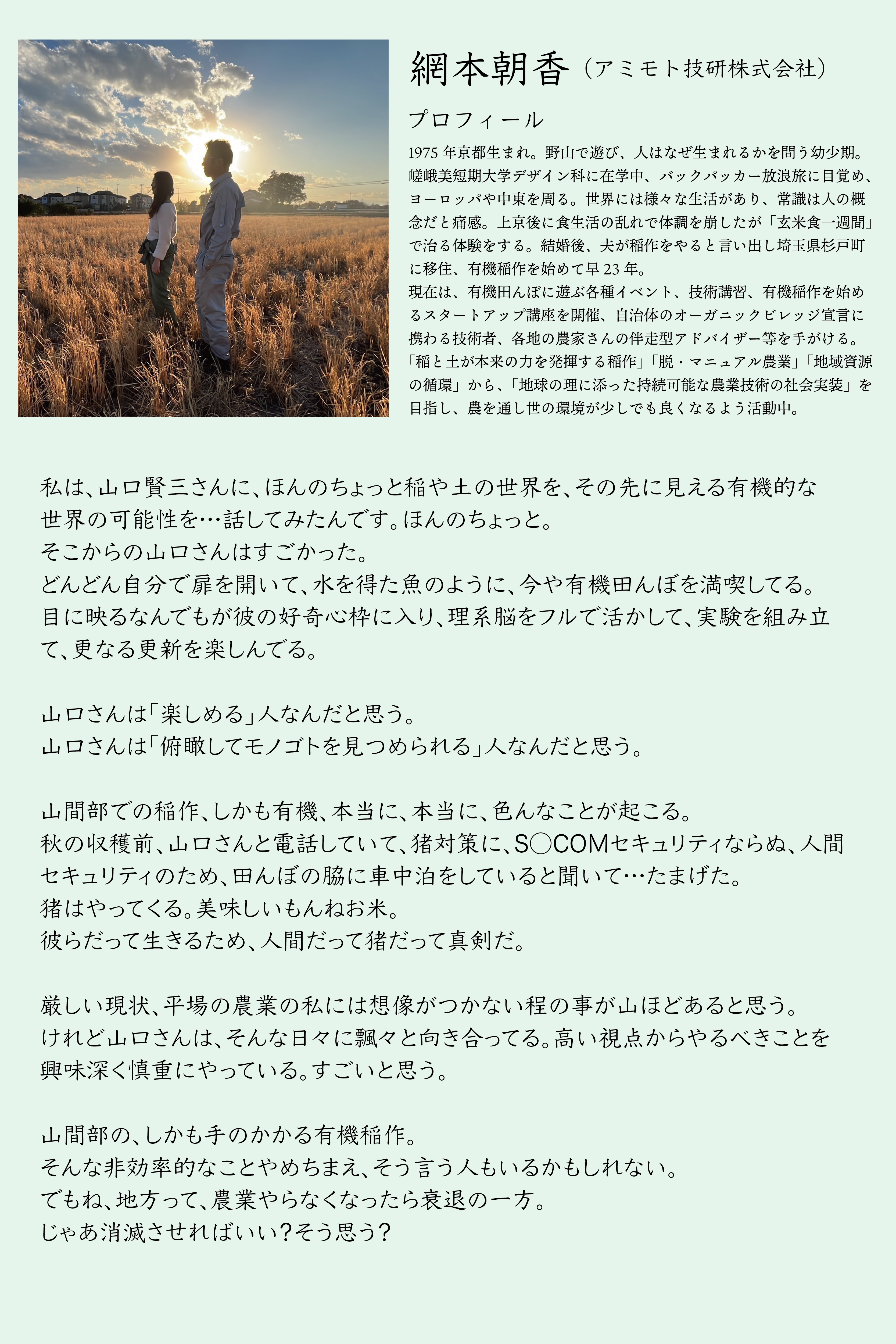 2023年に「ゆふ環境農園」を立ち上げ、現在は米・大豆・小麦を育てながら、