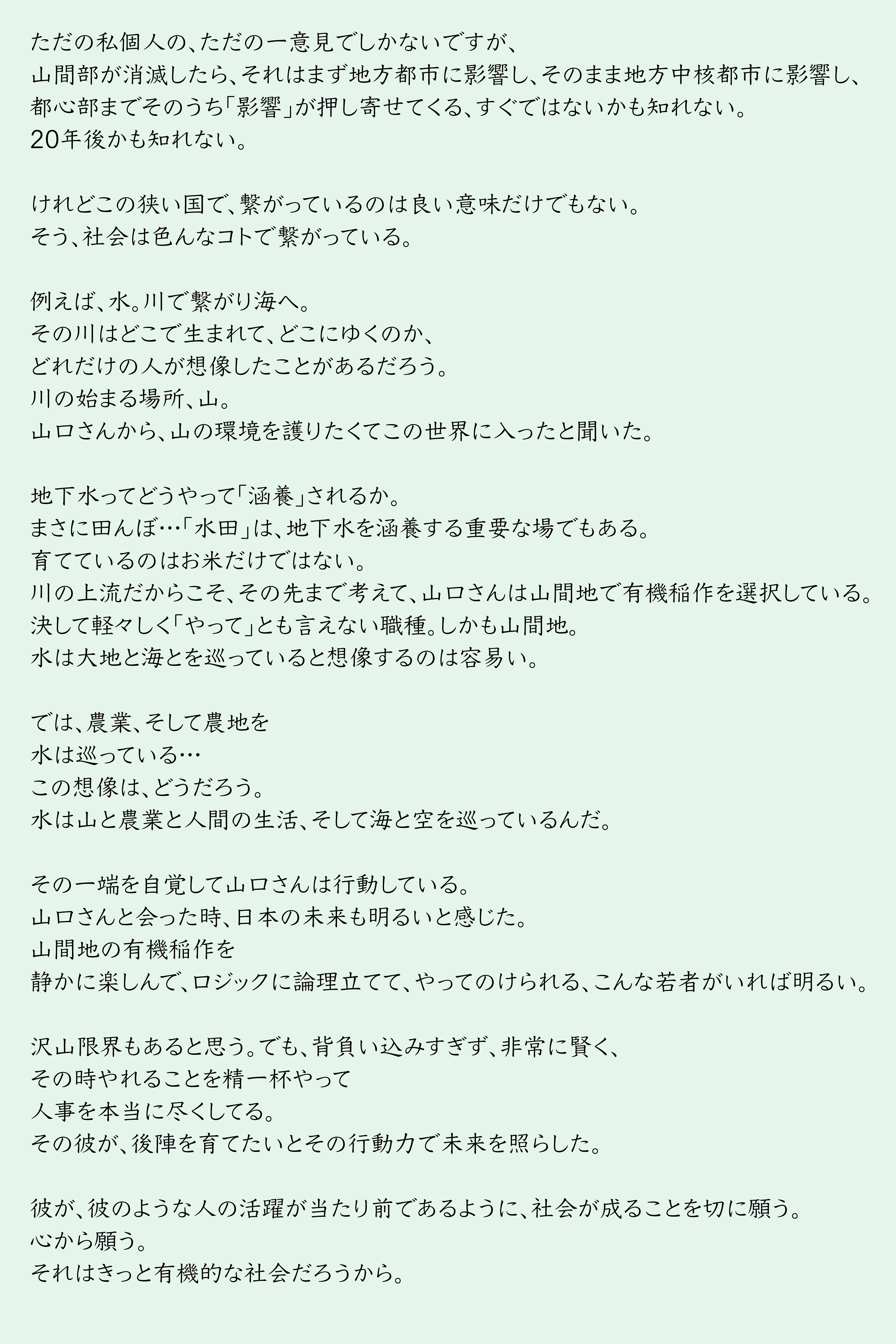 しかし、田畑が荒れ、草木が生い茂り、水路が管理されていないと、雨水は地面に浸透せず、一気に流れ出し、土砂崩れや河川の氾濫を引き起こすリスクが高まります。つまり、中山間地の農地を守るということは、単に地域の生業を守るだけでなく、「水の循環」や「人々の暮らしの安全」を守ることにもつながっているのです。