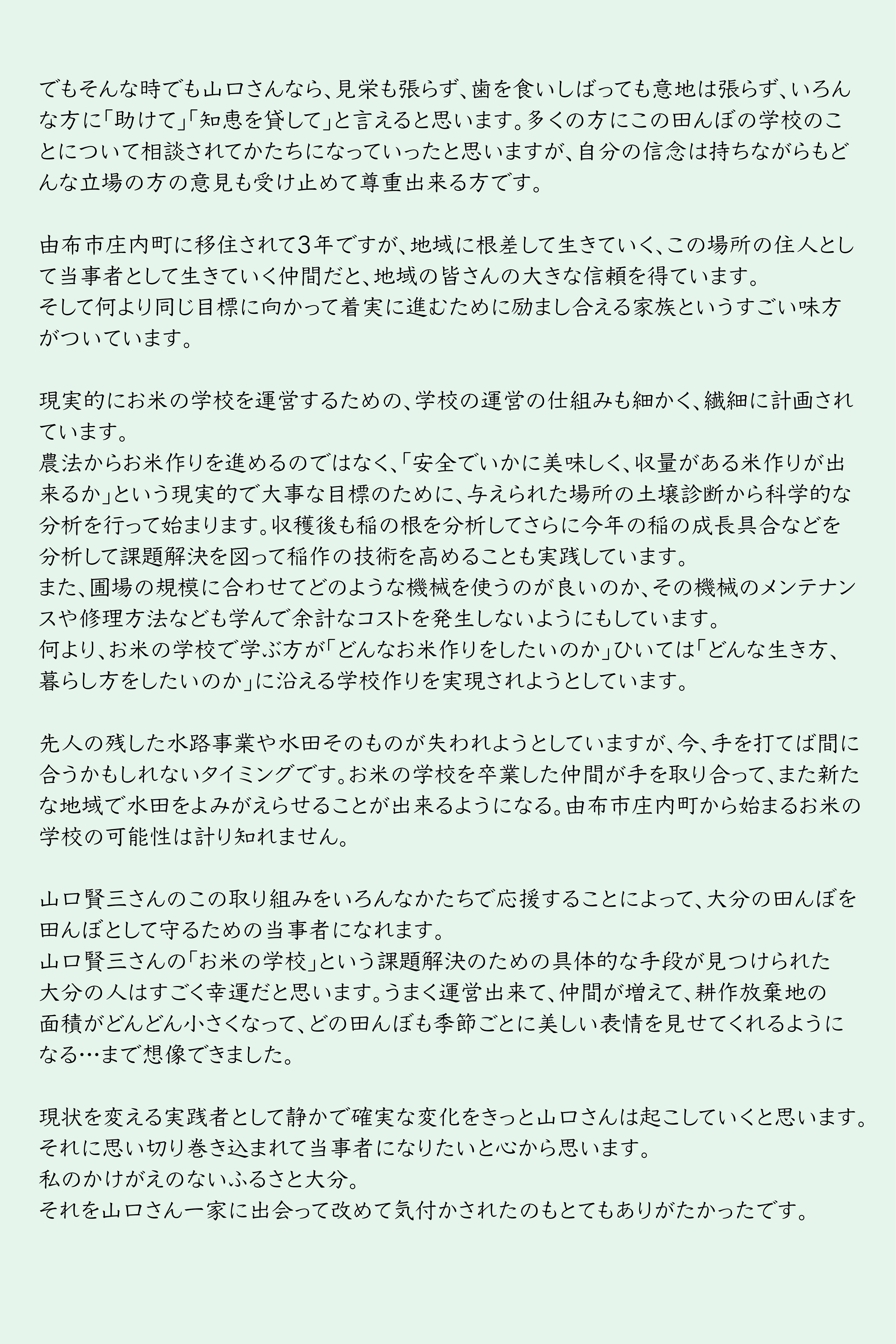 お米づくりの学校を通して未来の担い手を育てていく。この取り組みのモデルを構築し、さらに日本中に広がれば、里山の暮らし、環境は必ず持続可能な形で守られていくと信じています。