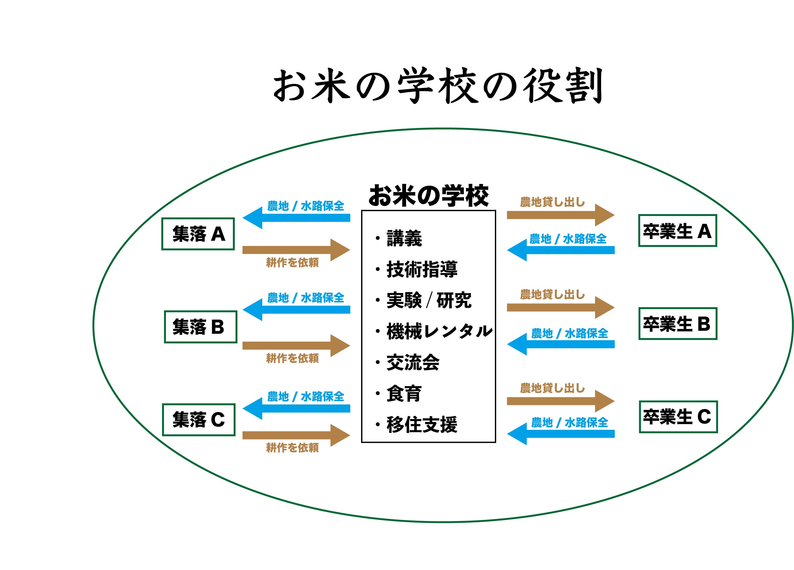 お米の学校は『中山間地域』と『新たな担い手』の仲介役。