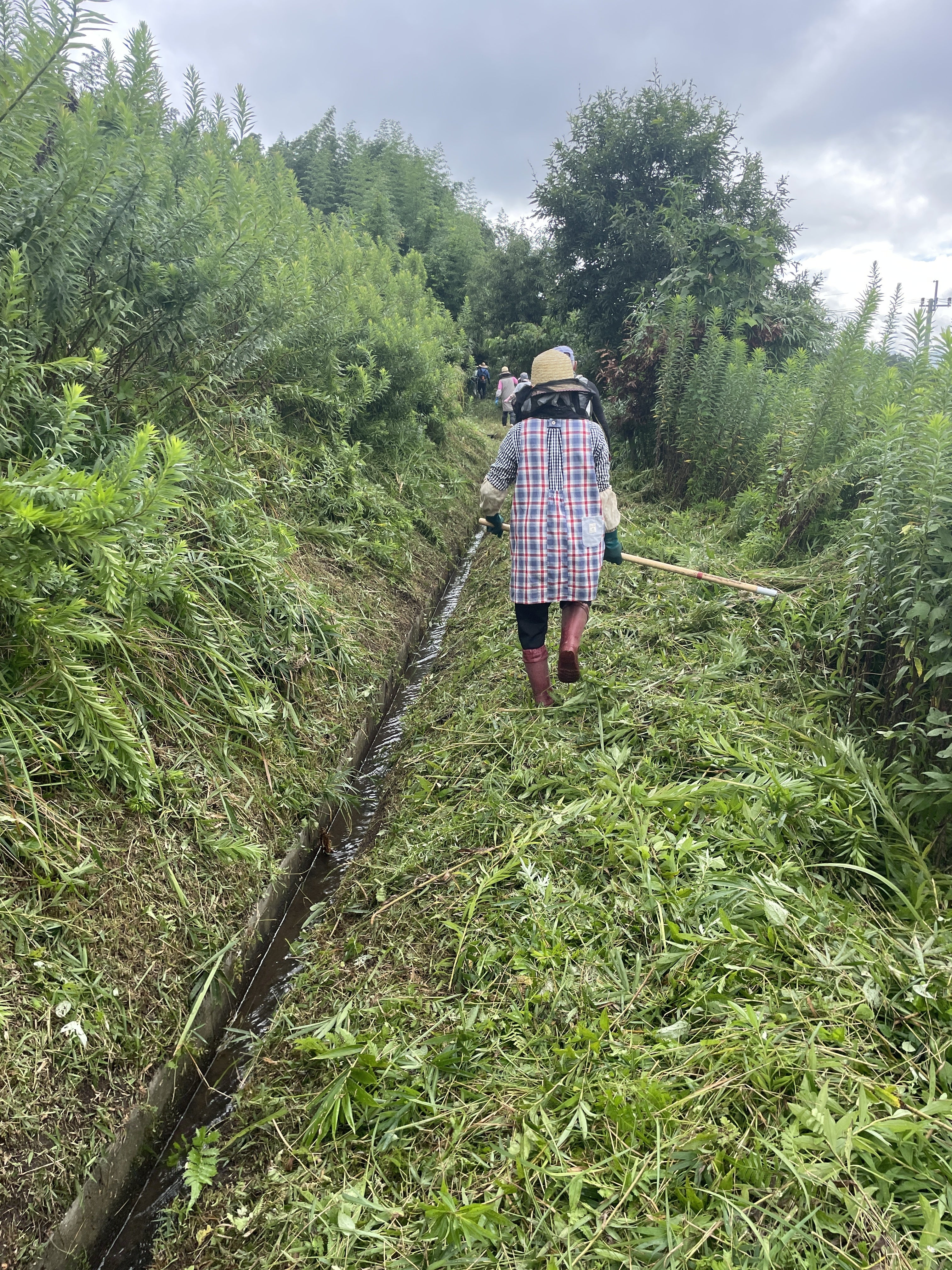 この写真は春先に田に水を引くための水路掃除の様子です。