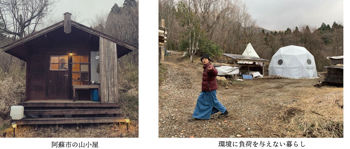 就職を選ばず、自分の手で生きる方法を模索する中で、2019年、結婚を機に長年サバイバル生活を実践している義父が住む熊本県阿蘇市の山奥へ移住。6畳ほどの山小屋で、電気・ガス・水道のないオフグリッドな暮らしを1年間経験します。
