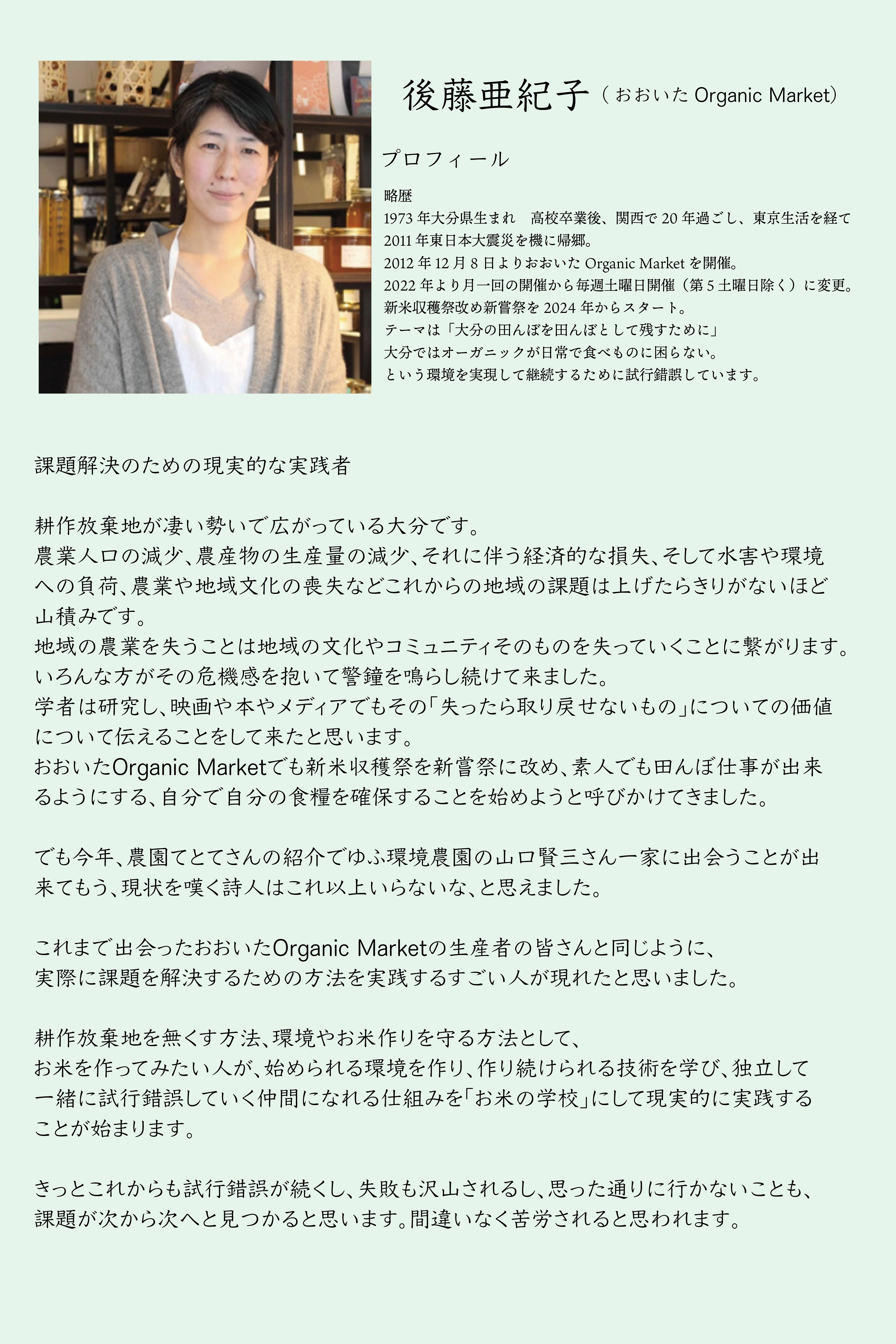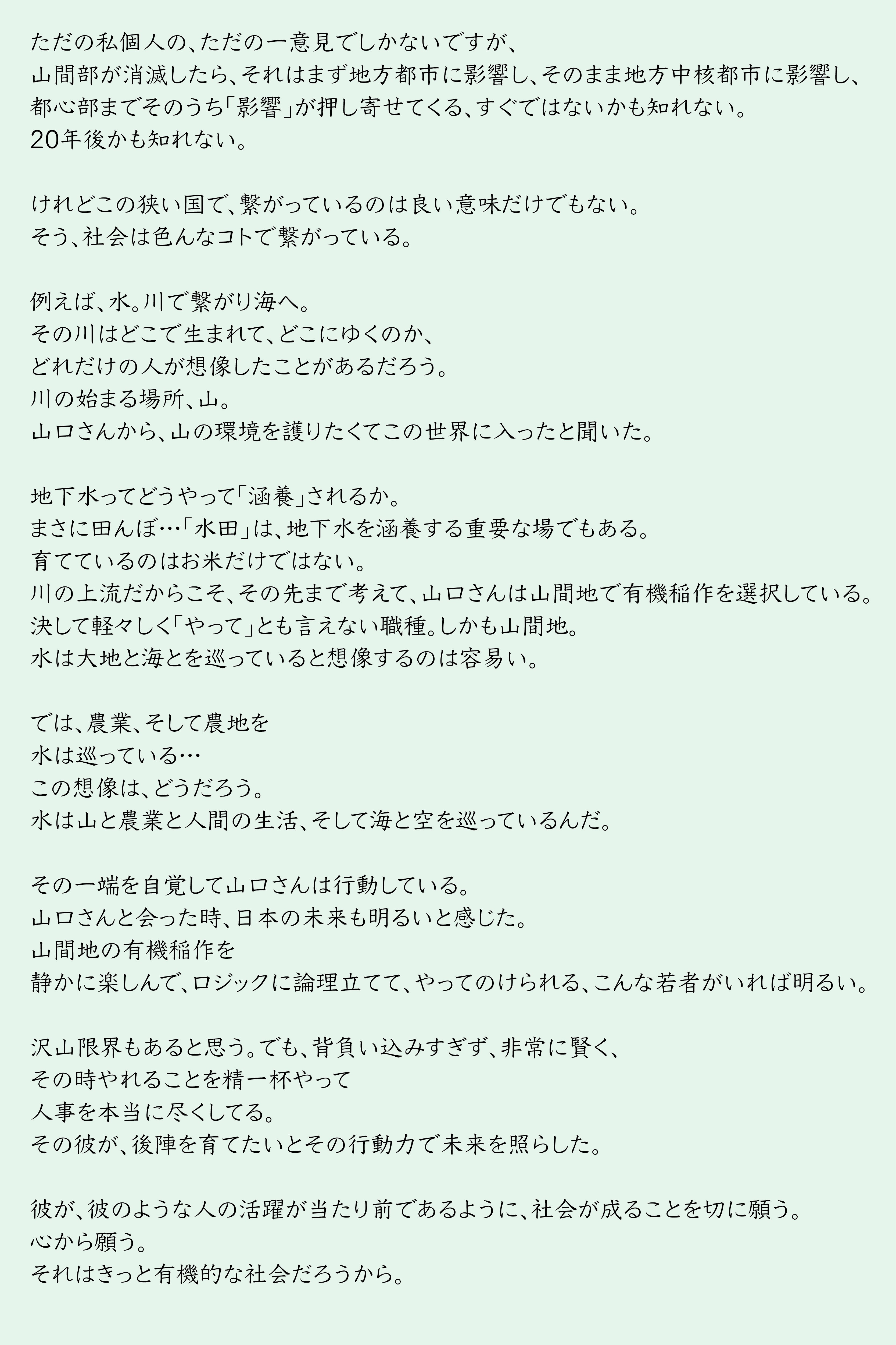 お米づくりの学校を通して未来の担い手を育てていく。この取り組みのモデルを構築し、さらに日本中に広がれば、里山の暮らし、環境は必ず持続可能な形で守られていくと信じています。