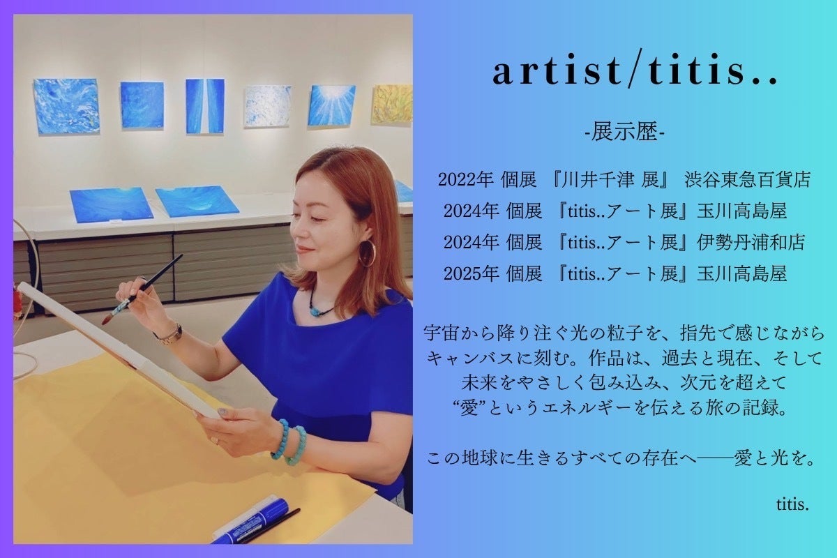 こんにちは。アーティストの titis..(ティティス) と申します。私は「天とつながり、受け取ったメッセージを“色と香り”で表現する」アーティストです。アロマオイルを絵の具に混ぜて描くことで、視覚と香りの両方から“癒し”と“エネルギー”を感じていただけるような抽象画を制作しています。