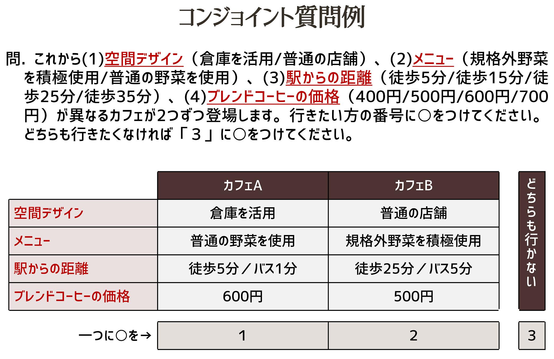 この調査によって得られたデータを統計的に分析することにより、最終的には「規格外野菜を積極活用する倉庫カフェ」に行く代わりに高くなっても良いと思うブレンドコーヒーの価格を計測することができます。