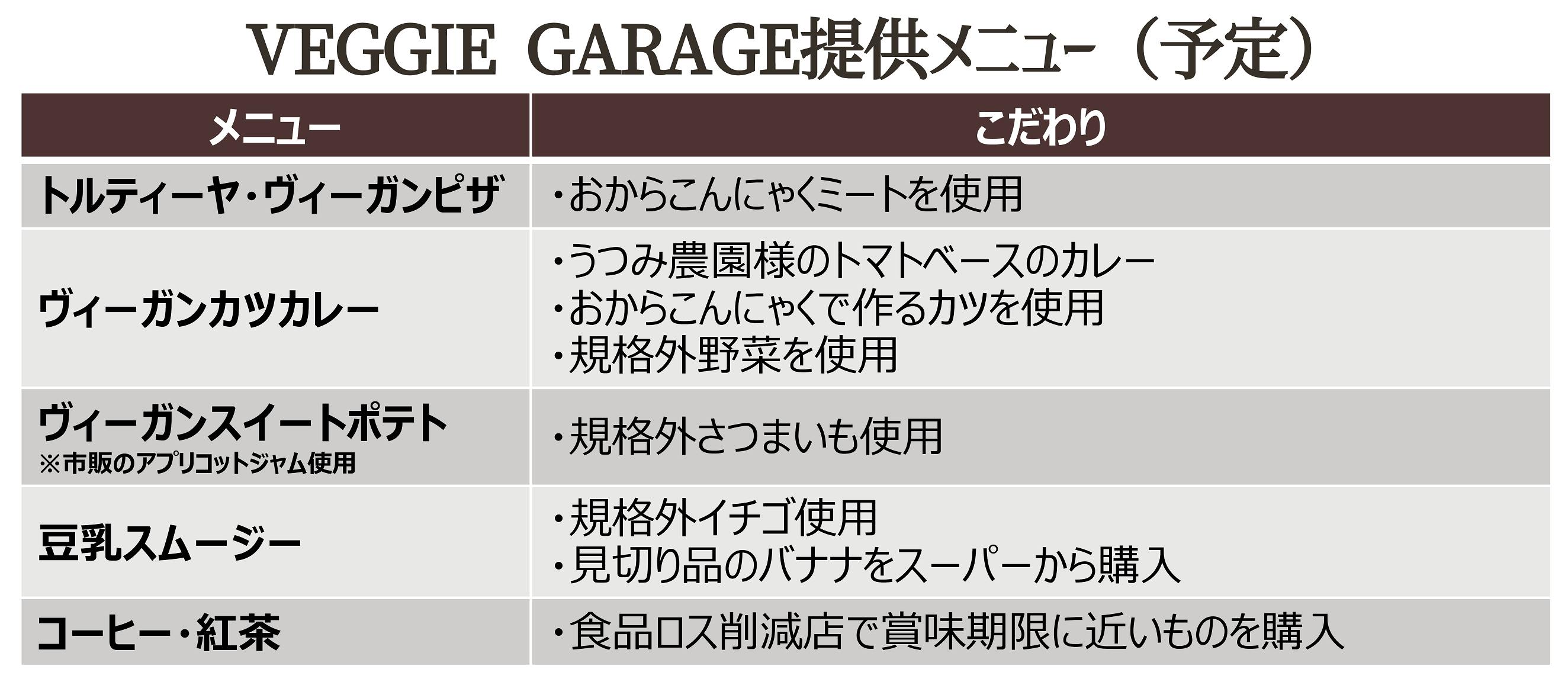 VEGGIE GARAGEでは、うつみ農園様のご支援のもと、できる限り規格外品・見切り品を活用し、環境への配慮から植物性食材にもこだわったメニューを提供します!