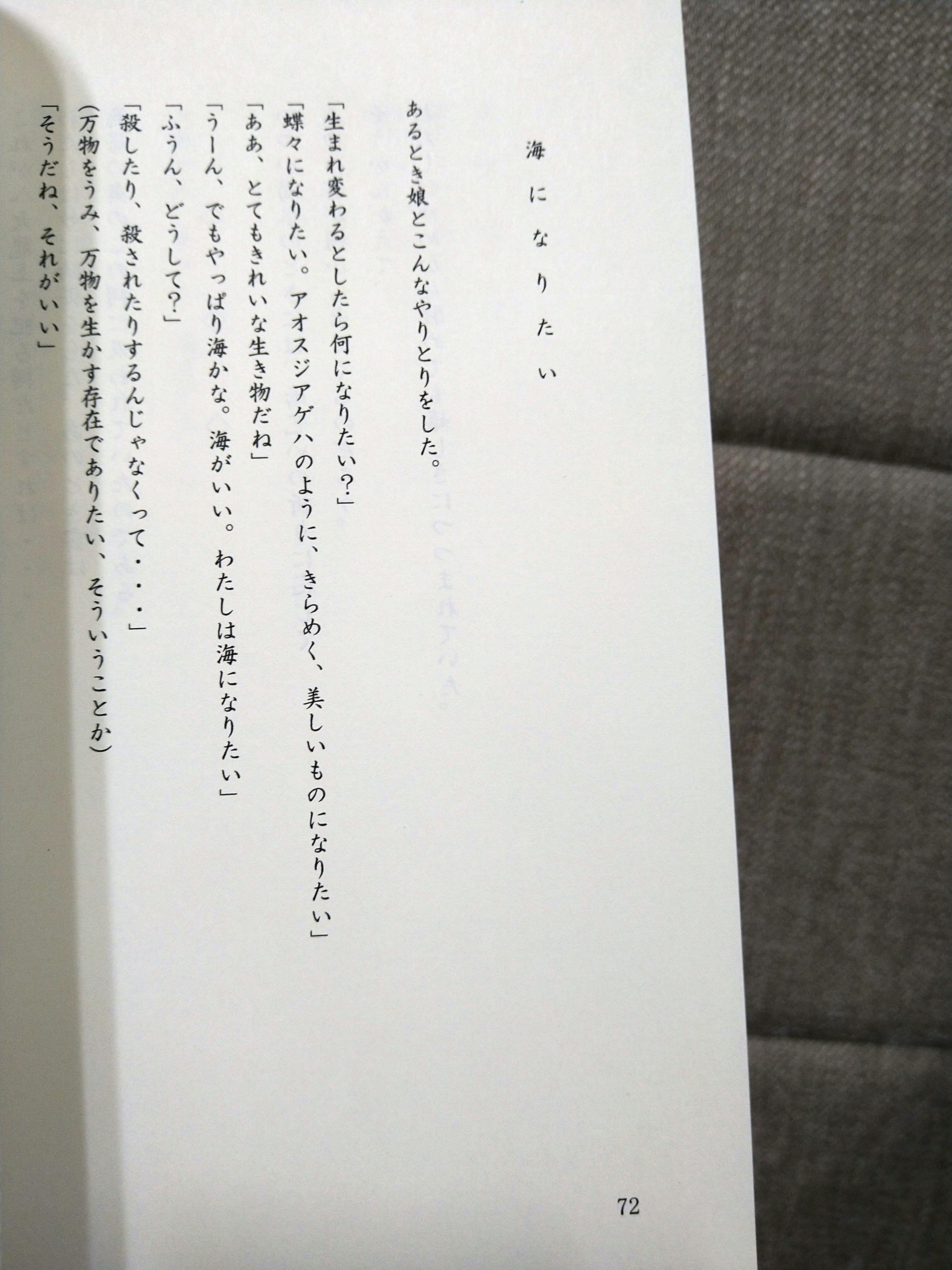 「「鳥たちの居場所」「よもつひらさかの眺望」「星の皺」等が心に残ります。そして随筆・散文の「石牛みちにまつわる話」寓話の警鐘が現在にあてはまることにも共感を覚えます。「人間の本性や本質は時代が変わっても―繰り返す」「本質を見極めようとする態度」を身につけなければと思います。そして「天啓」からも学ばせて頂きます。「海になりたい」にも惹かれます。もっと読みたい・・・もうおしまい・・・全篇、興味深く拝見し共感し納得致します。「青」美しい水を吸い上げた美しいアオスジアゲハの羽の色、印象に残ります。」