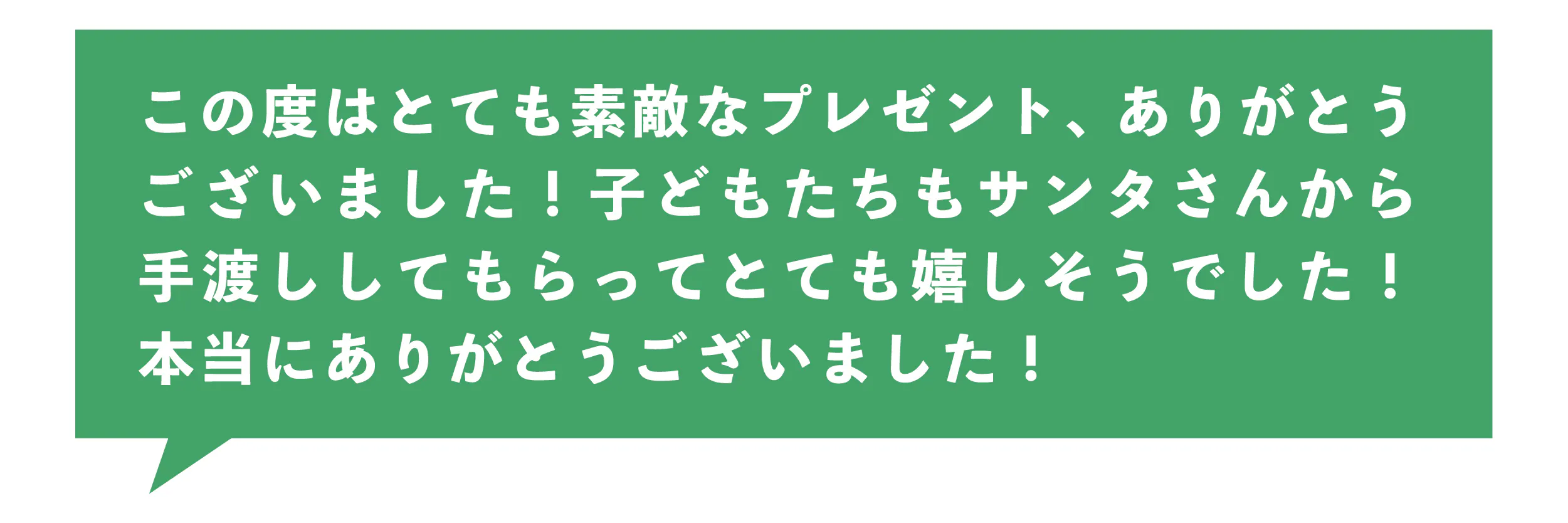毎年この季節になるとクラウドファンディングでご支援を募り、本企画を実施してまいりました。ご支援くださった方々、ボランティアでサンタさんを務めてくださった方々のお力添えがあって継続的に実施できています。ご協力のほど、誠にありがとうございます。