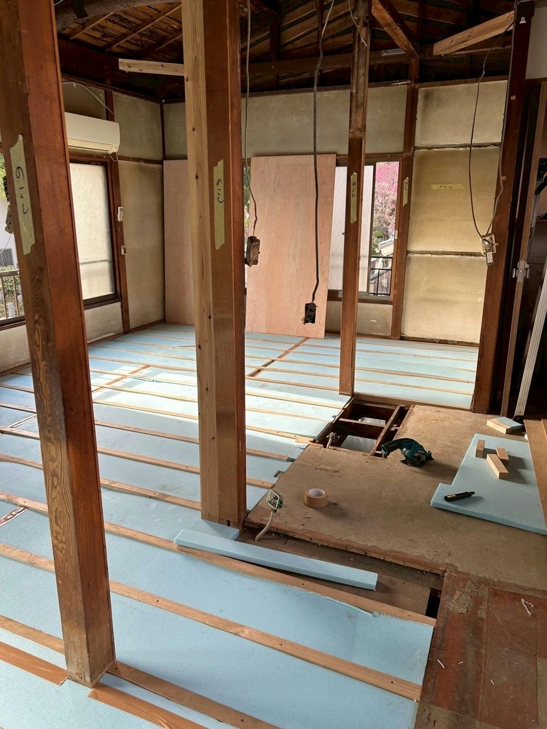まずは2階の床から、畳を取っ払ってしまったので、断熱剤を入れていきます。