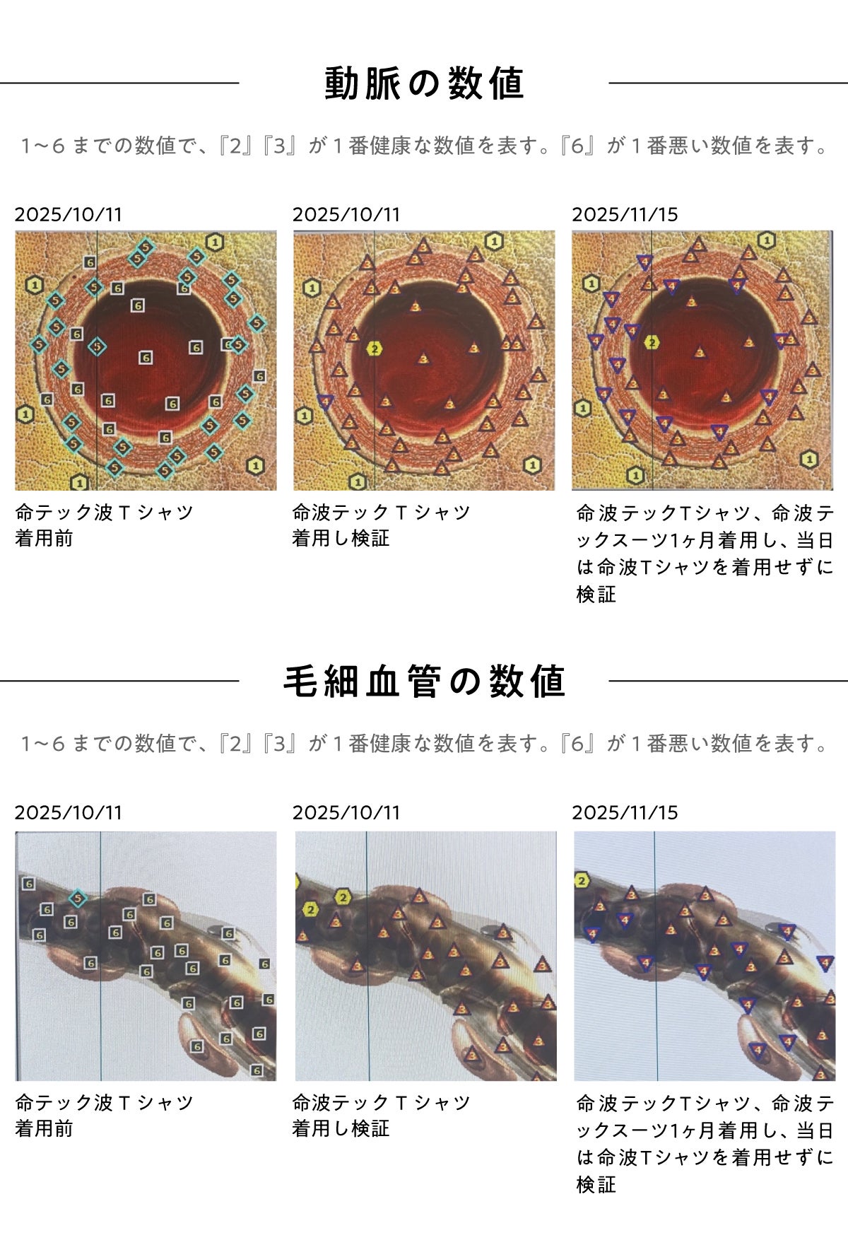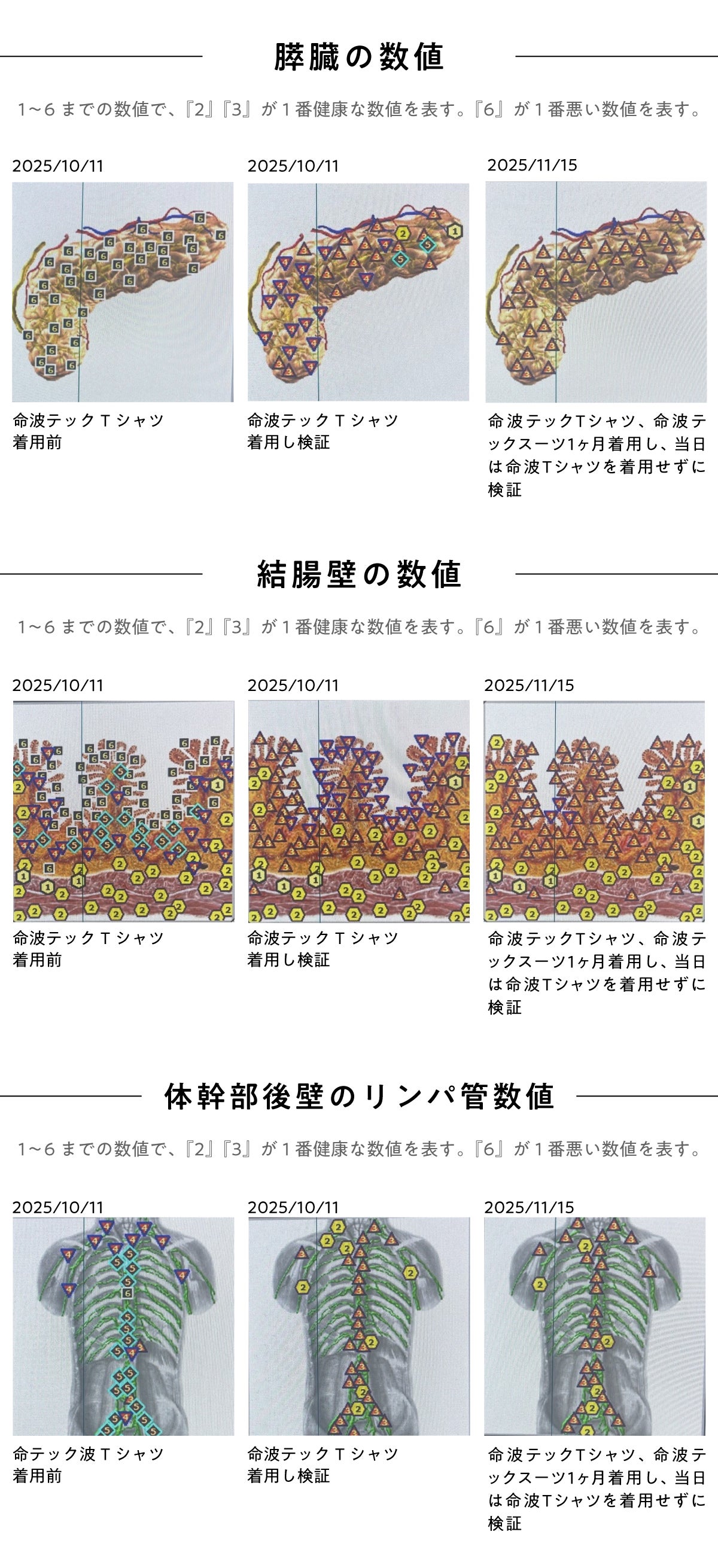 しかし、堂島ライフケアクリニック&大学&スポーツ施設との共同研究の結果、この命波テック加工を施したTシャツ(命波テックTシャツ)の着用者に有意な変化が見られたのです!