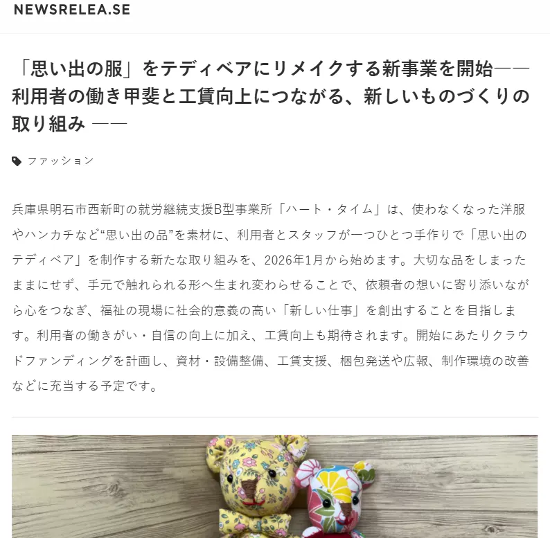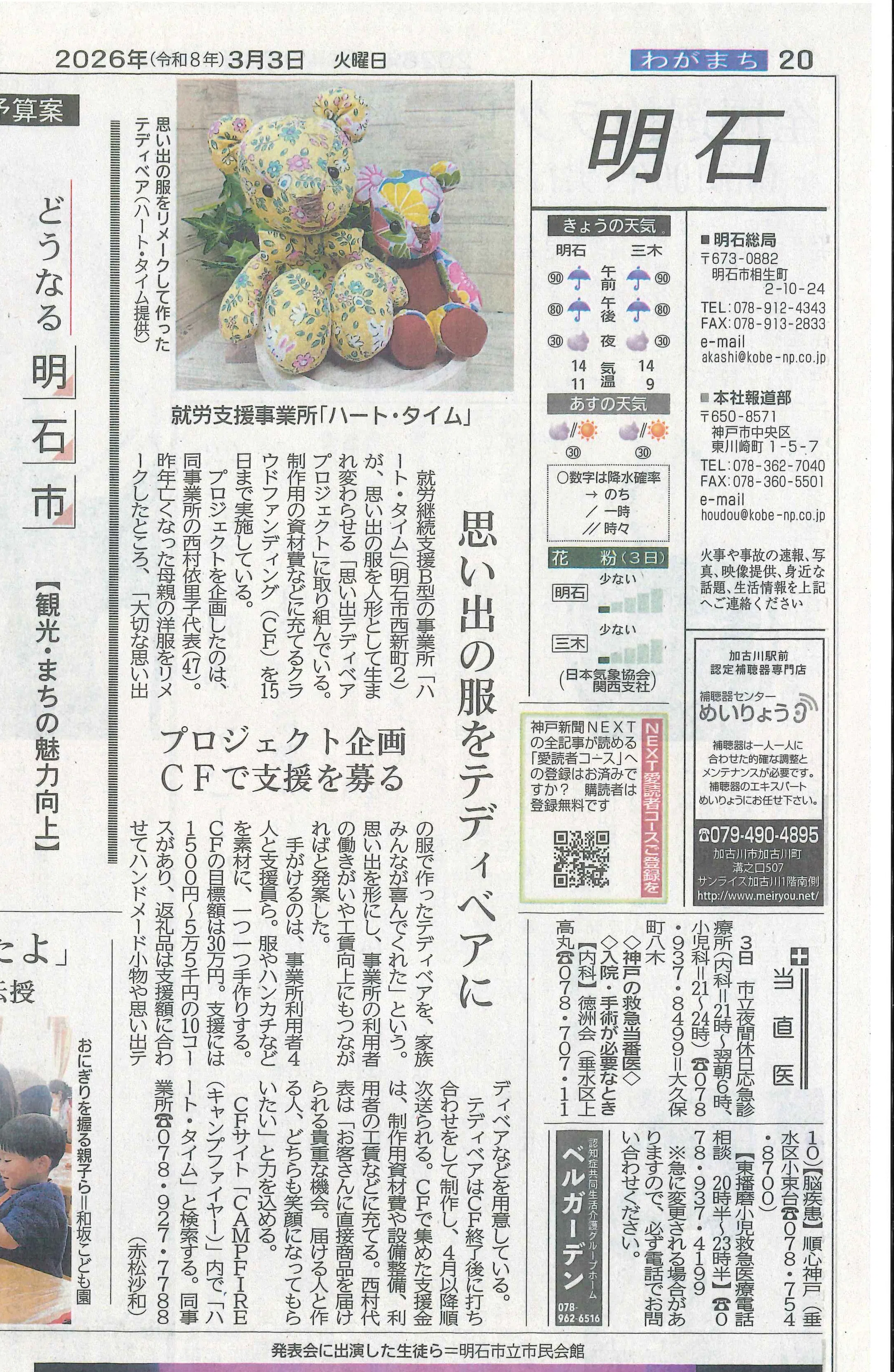 神戸新聞に掲載していただきましたいつも「思い出テディベアプロジェクト」を応援してくださり、本当にありがとうございます。このたび、本プロジェクトを神戸新聞様に取材・掲載していただきました。私たちの想い――大切な洋服を、抱きしめられるテディベアへ。そして、その制作を福祉の仕事としてつなげていくこと。その背景まで丁寧に取り上げていただき、心から感謝しています。記事をご覧になった方から「素敵な取り組みですね」「応援しています」という温かいメッセージも届いています。本当にありがとうございます。【現在の状況について】現在、目標30万円に対して、まだ達成には至っていません。終了は【3月15日】。正直な気持ちをお伝えすると、あと一歩、皆さまのお力が必要な状況です。このプロジェクトは、・思い出を未来へつなぐこと・福祉の新しい仕事を生み出すこと・“大切なものを大切にする社会”を広げることその第一歩です。【どうかお力をお貸しください】もし可能でしたら、・SNSでのシェア・ストーリーズでのご紹介・ご家族やご友人へのお声かけどんな形でも、大きな力になります。すでにご支援くださっている皆さまにも、改めて心から感謝申し上げます。最後まで、諦めずに挑戦します。思い出を「ぬくもり」に変えるこのプロジェクトを、どうか一緒に見届けていただけたら嬉しいです。引き続き、応援よろしくお願いいたします。