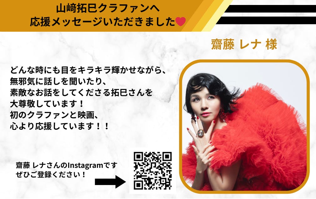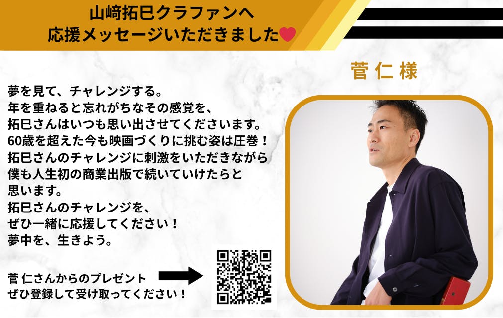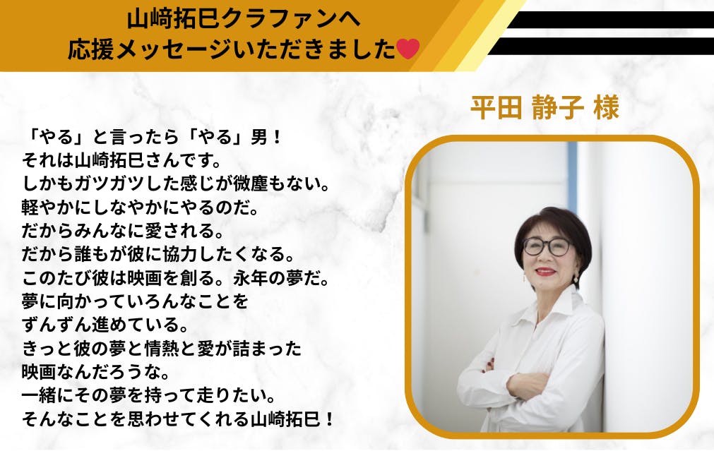 【齋藤レナ】様、【菅 仁】様、【平田 静子】様から、山﨑拓巳のクラウドファンディングへ応援メッセージをいただきました!