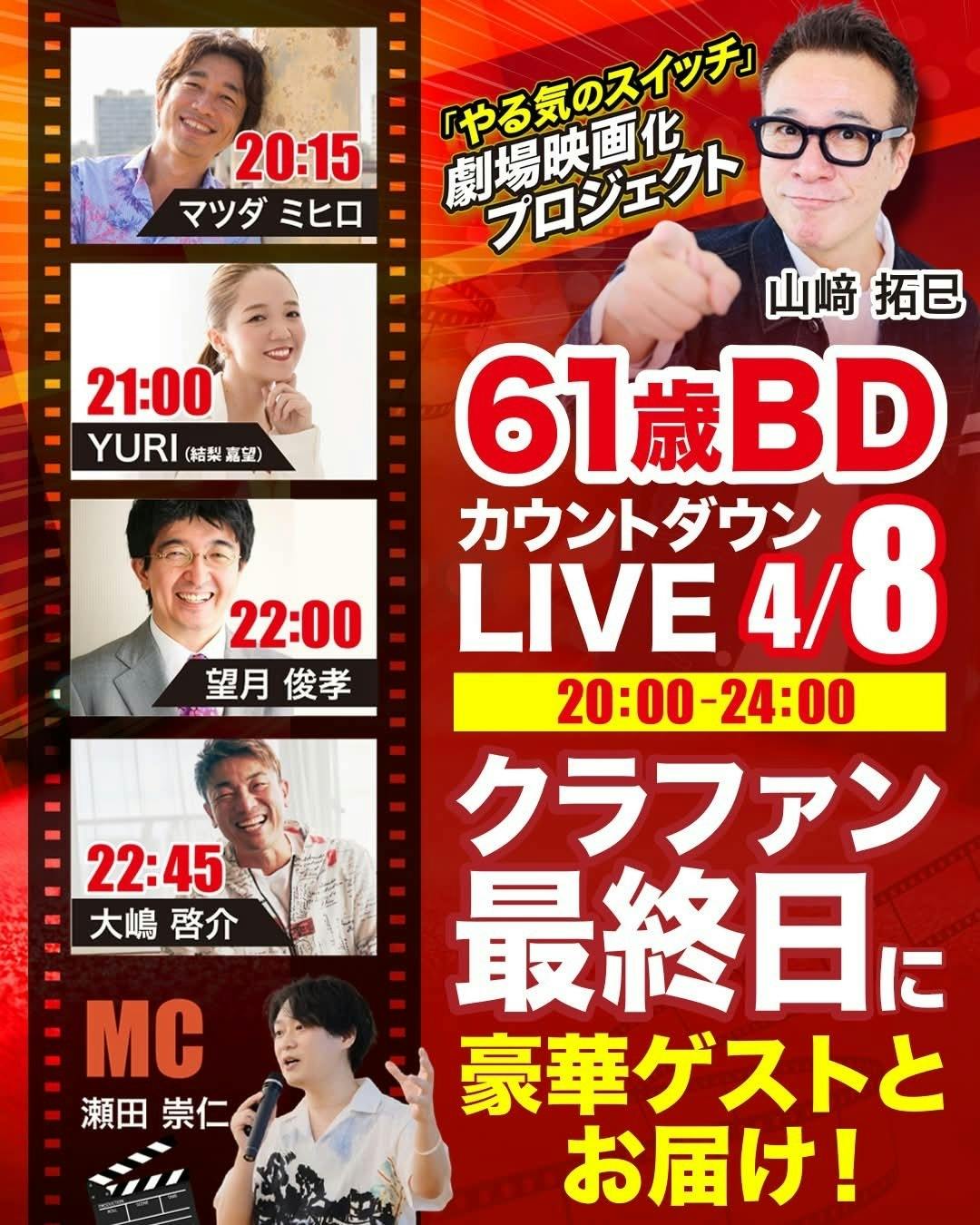 4人の豪華ゲストをお迎えし、まるで有料セミナーのような濃い内容でお届けしながら、山﨑拓巳の誕生日カウントダウンを皆さまと一緒に迎えたいと思っています。