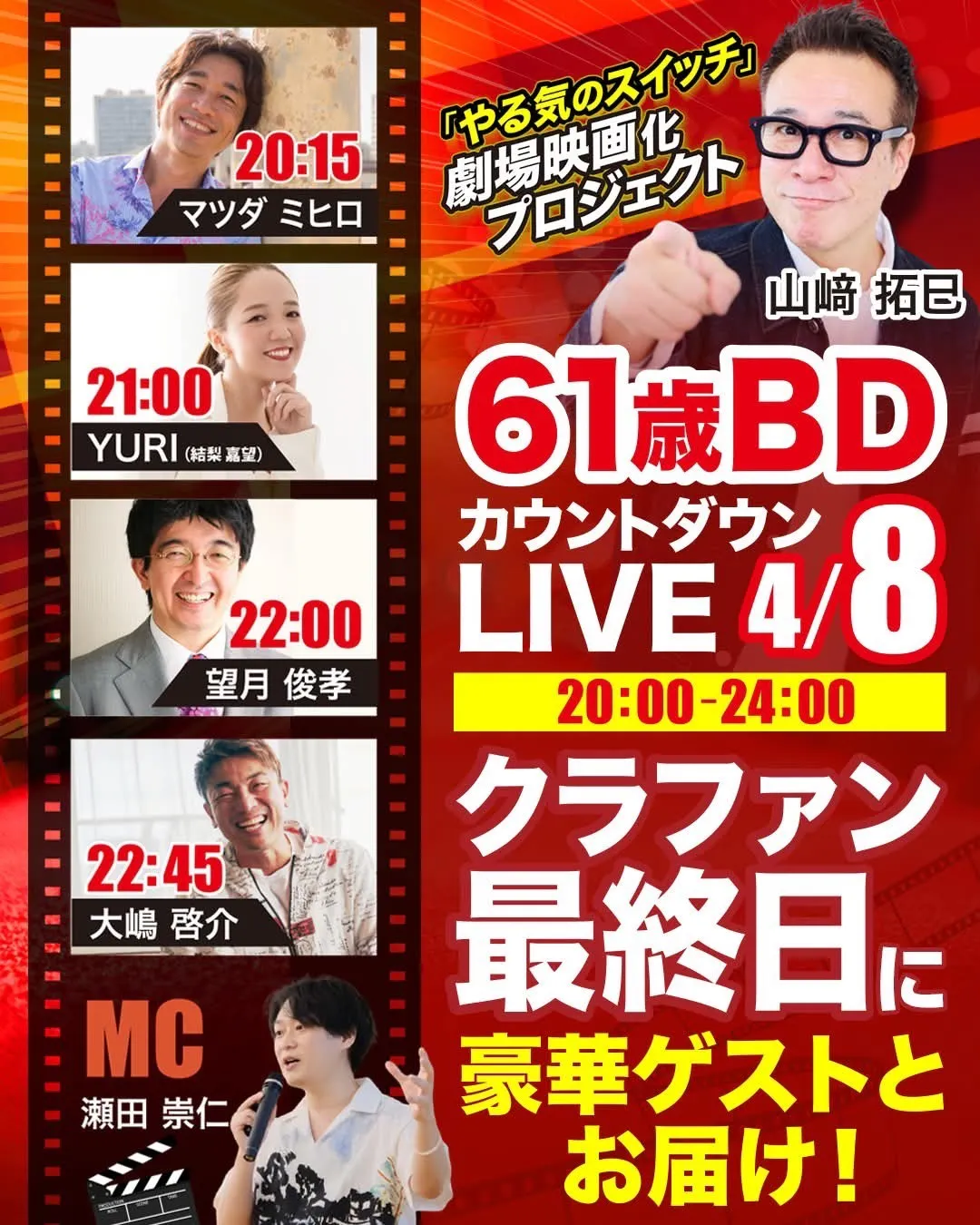 2026/03/26 09:304月8日(水)20:00〜24:00山﨑拓巳 誕生日前夜祭ライブ配信を開催します! そしてこの日は、クラウドファンディング最終日でもあります。ここまで本当にたくさんの方に支えていただき、この挑戦を続けてくることができました。心より感謝申し上げますm(_ _)m 今回のライブは、ただのお祝いでは終わりません。4人の豪華ゲストをお迎えし、まるで有料セミナーのような濃い内容でお届けしながら、山﨑拓巳の誕生日カウントダウンを皆さまと一緒に迎えたいと思っています。 <豪華ゲストの皆様>・マツダミヒロさん・YURI(結梨嘉望)さん・望月俊孝さん・大嶋啓介さん豪華ゲストの皆さんとともにお届けする、特別な誕生日前夜祭ライブ。この一夜を、ぜひ一緒に過ごしていただけたら嬉しいです。 顔出しなし・途中参加・途中退出もOKですので、どうぞお気軽にご参加ください! ご参加は、下記フォームよりメールアドレスをご登録ください。(所要時間 20秒程度)返信メールにて、当日の視聴リンクをお送りいたします。↓↓https://pro.form-mailer.jp/fms/053845b8335428 もっと見る「山﨑拓巳をあなたのオンラインセミナーに呼べる権利」でご支援いただいたzoomセミナーに出演します!