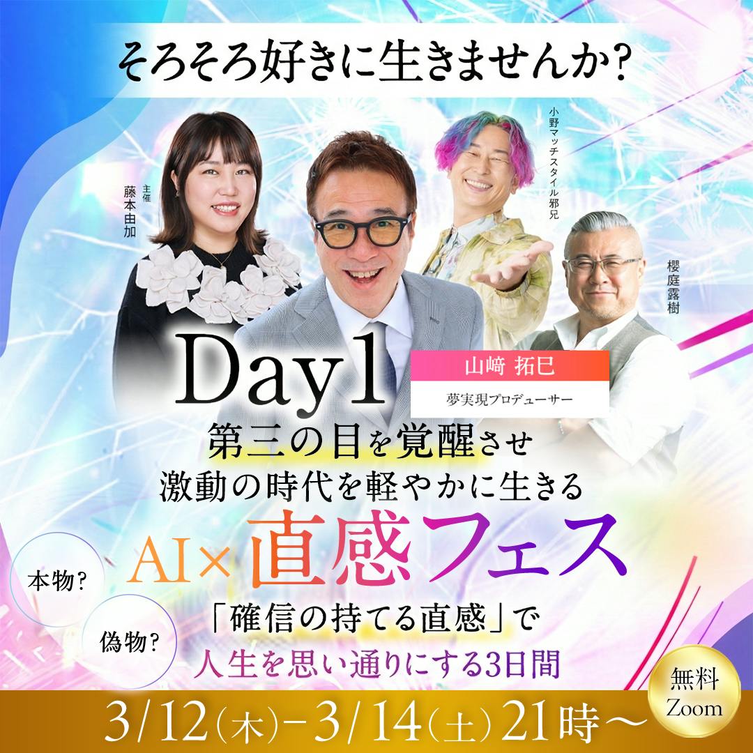 2026/03/09 23:26クラファンのリターンで「山﨑拓巳をあなたのオンラインセミナーに呼べる権利」をご支援くださった 霊視占い師 藤本由加さんが、早速オンラインセミナーに呼んでくださいます!!『AI × 直感フェス』開運セミナー講師 櫻庭露樹さんYouTubeプロデューサー 小野マッチスタイル邪兄さんそして、夢実現プロデューサー 山﨑拓巳の3人が登壇して、『直感』をテーマにお話ししていきます。3月12日(木)21:35-21:55 山﨑拓巳、登壇します!テーマは『激動のAI時代を自由に豊かに生きるための最新の『直感』とは?」無料のセミナーなので、ぜひご参加くださいね〜!!↓↓https://utage-system.com/p/I8ODKBz3hMkg「山﨑拓巳をあなたのオンラインセミナーに呼べる権利」のリターン【満員御礼につき追加】で現在もご提供させていただいてます!良かったらあなたのオンラインセミナー(インスタライブでも大丈夫です)に山﨑拓巳を呼んでくださいね!! もっと見る