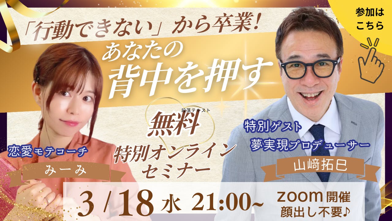 2026/03/16 21:52クラファンのリターンで「山﨑拓巳をあなたのオンラインセミナーに呼べる権利」をご支援くださった 恋愛モテコーチみーみさんが、オンラインセミナーに呼んでくださいます!!『「行動できない…」から卒業!あなたの背中を押すオンラインセミナー』恋愛や人生において「行動したいのに動けない」と感じている方に向けて、やさしく背中を押すような時間をテーマにしております。【開催日時】2026年3月18日(水)21:00〜主催:恋愛モテコーチみーみ特別ゲスト:山﨑拓巳【開催形式】Zoomオンラインセミナー(無料)みーみさんのLINE公式アカウントに登録していただくと、当日のzoomアドレスをお送りいただけるそうです。まずは下記へご登録ください!↓↓https://lin.ee/524R5PK「山﨑拓巳をあなたのオンラインセミナーに呼べる権利」のリターン現在もご提供させていただいてます!良かったらあなたのオンラインセミナー(インスタライブでも大丈夫です)に山﨑拓巳を呼んでくださいね!! もっと見る