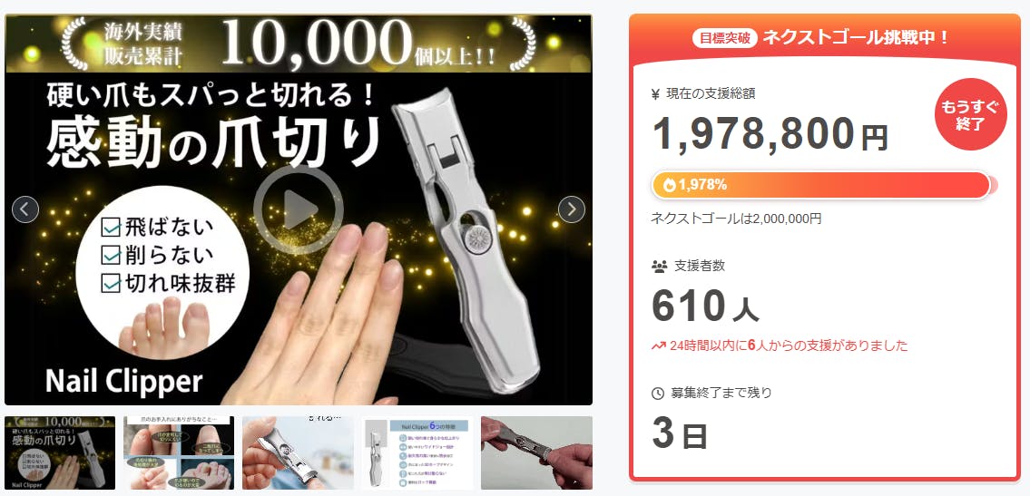 2026/01/28 12:00この度は「硬い爪もスパッと切れる!爪が飛び散らない・やすり掛けもいらない快適な究極の爪切り」に支援頂き、ありがとうございます!お陰様で、支援総額197万円達成することができました。ご興味のある方、ぜひ支援お願い致します。https://camp-fire.jp/projects/900256/viewBrightチームは、当プロジェクトをもっと多くの方に知っていただきたいと考えております。よかったら、FacebookやTwitter等のSNSでのシェア・拡散をお願い致します。#brightdiyどうぞよろしくお願い致します。Brightチーム もっと見る