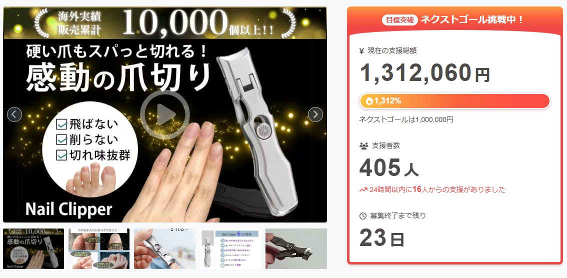 2026/01/08 12:02この度は「硬い爪もスパッと切れる!爪が飛び散らない・やすり掛けもいらない快適な究極の爪切り」を支援いただき、本当にありがとうございます。おかげさまで開始から1時間30分で目標を達成することが出来ました。また本日のCampfireランキングプロダクト部門 6 位に入賞することが出来ました!皆さまの支援を励みに、喜んでいただける製品作りに努めてまいります。1月末まで販売期間は続きますので、ぜひSNSでのシェアや身近な方にもおすすめしていただけると嬉しく思います。https://camp-fire.jp/projects/900256/viewどうぞよろしくお願いいたします。ありがとうございました。スタッフ一同Brightチーム もっと見る