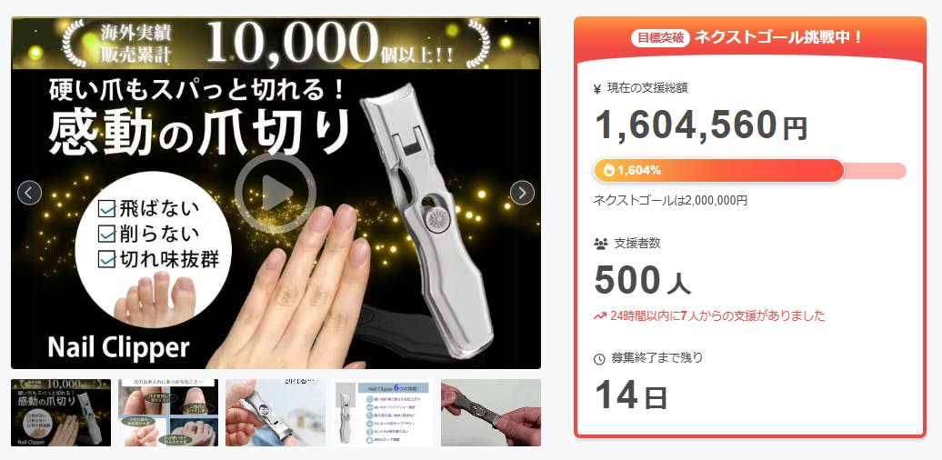 2026/01/17 12:00この度は「硬い爪もスパッと切れる!爪が飛び散らない・やすり掛けもいらない快適な究極の爪切り」に支援頂き、ありがとうございます!お陰様で、支援総額160万円達成することができました。ご興味のある方、ぜひ支援お願い致します。https://camp-fire.jp/projects/900256/viewBrightチームは、当プロジェクトをもっと多くの方に知っていただきたいと考えております。よかったら、FacebookやTwitter等のSNSでのシェア・拡散をお願い致します。#brightdiyどうぞよろしくお願い致します。Brightチーム もっと見る