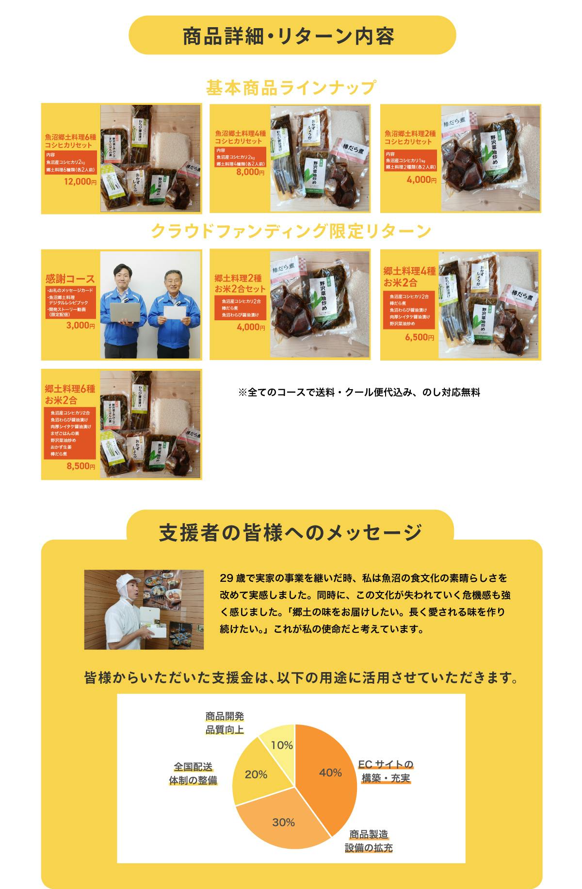 魚沼産コシヒカリ2合 郷土料理4種類(各2人前) ・野沢菜油炒め 原材料名 野沢菜(国産)、かつお節、人参、醤油(小麦・大豆含む)、サラダ油、砂糖、ゴマ油、清酒、味醂、醸造酢、昆布、ごま、生姜、とうがらし、食塩、調味料(アミノ酸等) 内容量 120g 保存方法 冷蔵10℃以下 開封後はお早めにお召し上がりください ・おかず生姜 原材料名 生姜(国産)、砂糖、醤油(大豆・小麦含む)、かつお節、食塩 内容量 150g 保存方法 冷蔵(10℃以下で保存) 開封後はお早めにお召し上がりください ・ 魚沼わらび醤油漬け 原材料名 わらび(魚沼産)、醤油(小麦・大豆含む)、鰹だし、昆布だし、砂糖、塩、とうがらし、酒、酢、味醂 内容量 130g 保存方法 直射日光を避け、冷暗所で常温保存してください 開封後はお早めにお召し上がりください ・ 棒だら煮 原材料名 たら(国産)、砂糖、水あめ、醤油(大豆・小麦含む)、鰹だし、昆布だし、味醂、酒、塩 内容量 240g 保存方法 冷蔵10℃以下で保存 開封後は早めにお召し上がり下さい 製造者 新潟県魚沼市千溝755 有限会社 大栄食品 TEL 025-792-2095