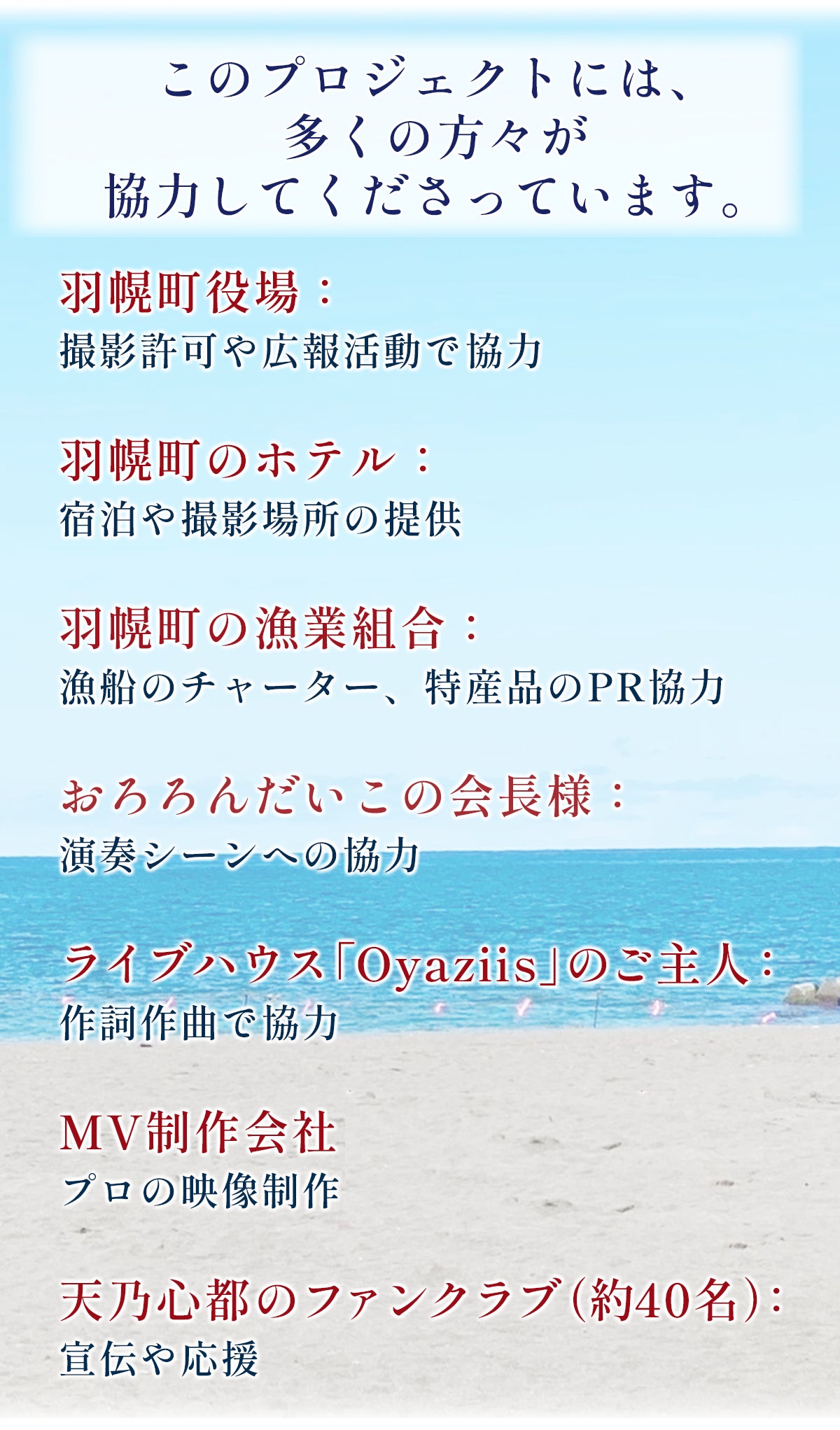 このクラウドファンディングが成功し、ミュージックビデオが完成し、全国に羽幌町の魅力が広まる。その実績を持って、天乃心都を観光大使に推薦したい。そして、彼女には、羽幌町の顔として、さらに魅力を発信し続けてほしいです。