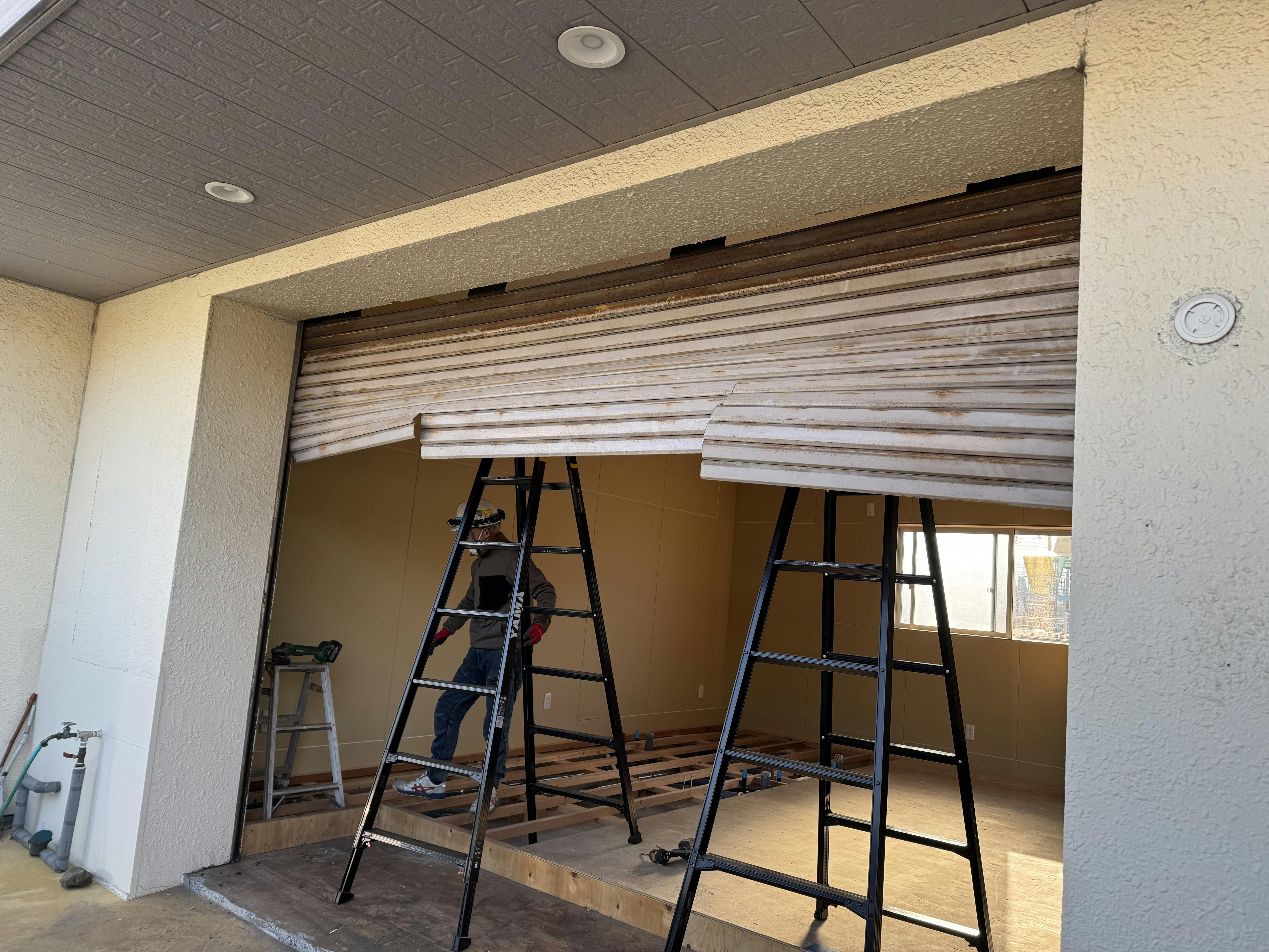 昨日2月14日、店舗のシャッターを撤去してもらいました。私が行った時にはシャッター屋さんがもう半分くらい撤去してました。このあと、工務店さんが壁を作ってくれてますが、出入口や窓がつくのはまだ先になります。