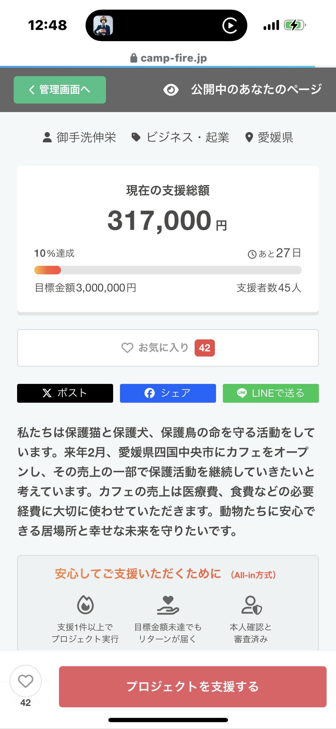 2025/12/05 10:00おかげさまで30万円突破!物価高騰の中、お心をお寄せいただきありがとうございます!目標金額は高く設定してますが、正直初のクラファンでこんなに皆様に応援していただけるなんて思ってもみませんでした。本当に有難いです。前の報告に書いたかどうか、ちょっと思い出せないのですが…カフェは私一人で営業します。いわゆるワンオペです。姉と夫には安定した収入を守ってもらいます。そしてワンオペで得た売上から必要経費を除き、残りは全て保護動物の生活のために使います。とりわけ医療費は毎月かなりの支出なので、そこを賄えるようがんばる所存です。保護した子の中には、まだ避妊手術が出来てない子がおります。不幸な子を増やさない、また病気予防の為にも避妊手術は必須です。男の子は、ほぼ去勢が出来ていません。なかなかそこまで手が回らないのが現状です。私は給料は一切貰うつもりはありません。幸い接客は好きなので、それほど苦にならない………ハズ。それで不幸な動物たちを減らしていけるのであれば、喜んで働きますよ!引き続き応援よろしくお願いします。 もっと見る