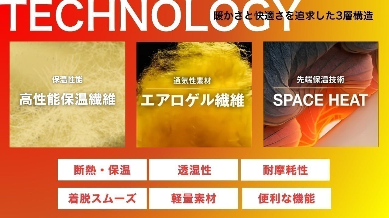 さらにSPACE HEAT技術を採用した生地は、保温性に優れているだけでなく吸湿性も抜群なので、汗をかいても、しっかりと吸湿。快適にお過ごしいただけます。
