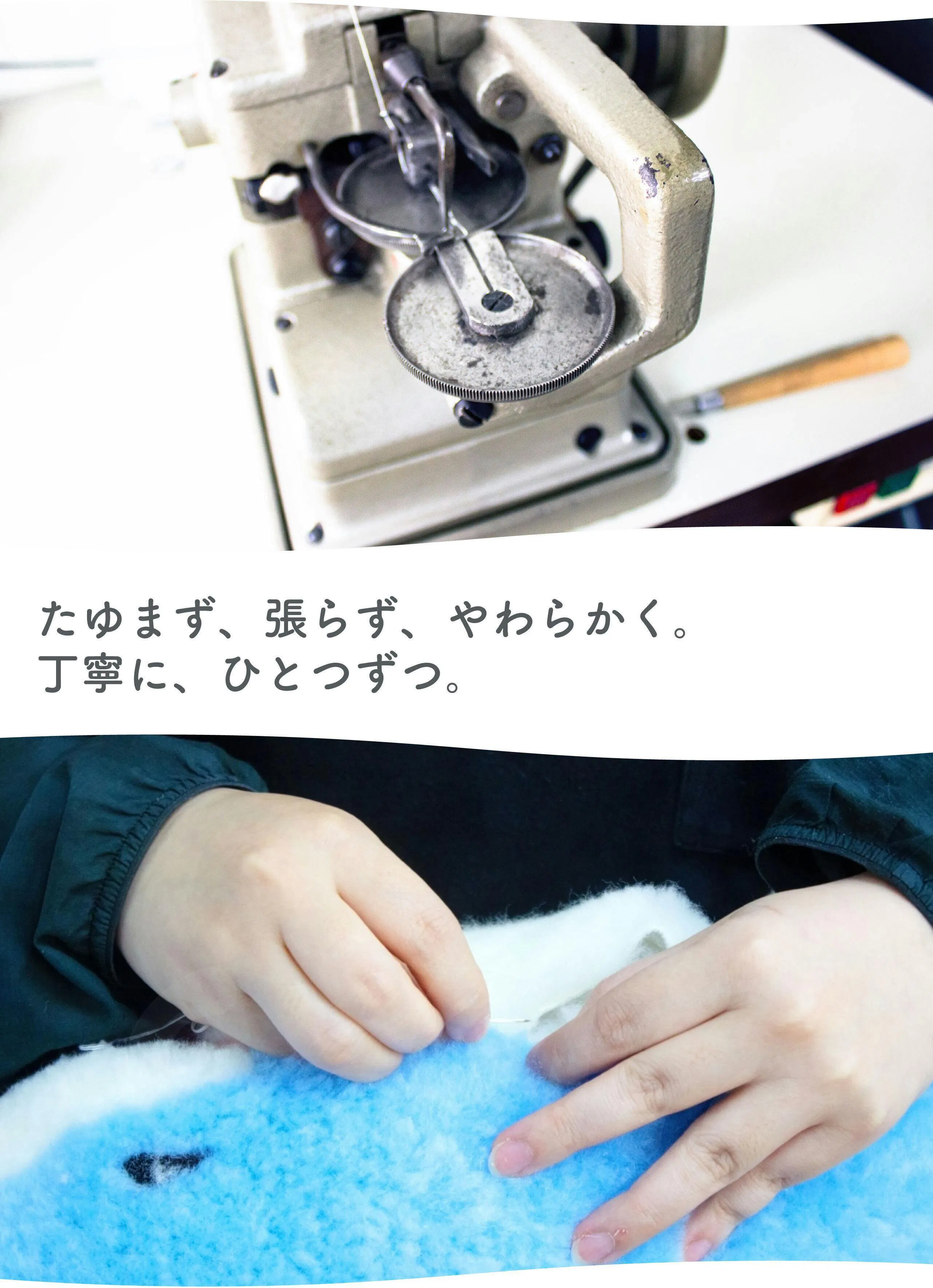 ぬいぐるみのなかまたちは、日本の職人が手作業で、丁寧に真心込めて縫い合わせています。