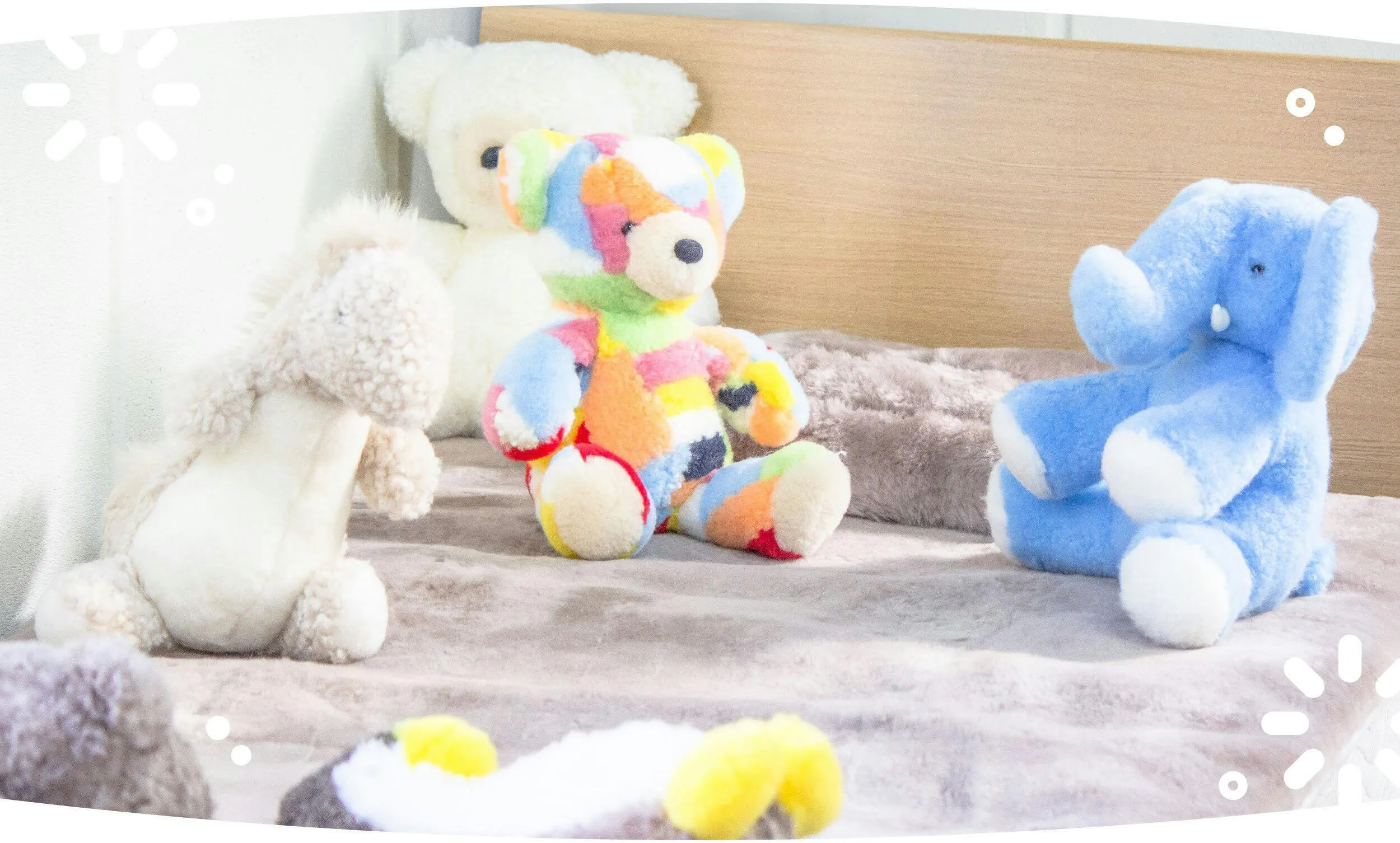 ベッドの傍らに、ぬいぐるみたちが見守るように並んでいました。