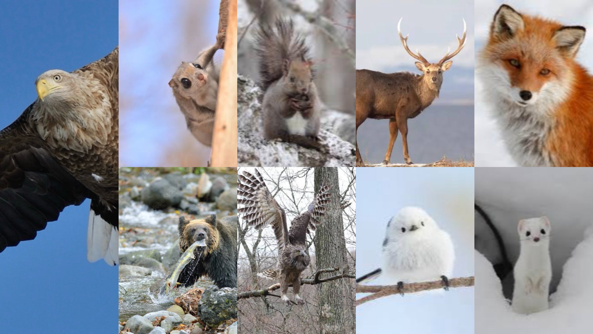 この厳しくも豊かな北の大地で、たくましく生きる動物たちとの出会いが全ての始まりでした。(エゾヒグマ、エゾフクロウ、エゾリス、エゾモモンガ、ツル、キタキツネ、オジロワシ、オコジョ、シマエナガ、エゾシカ)