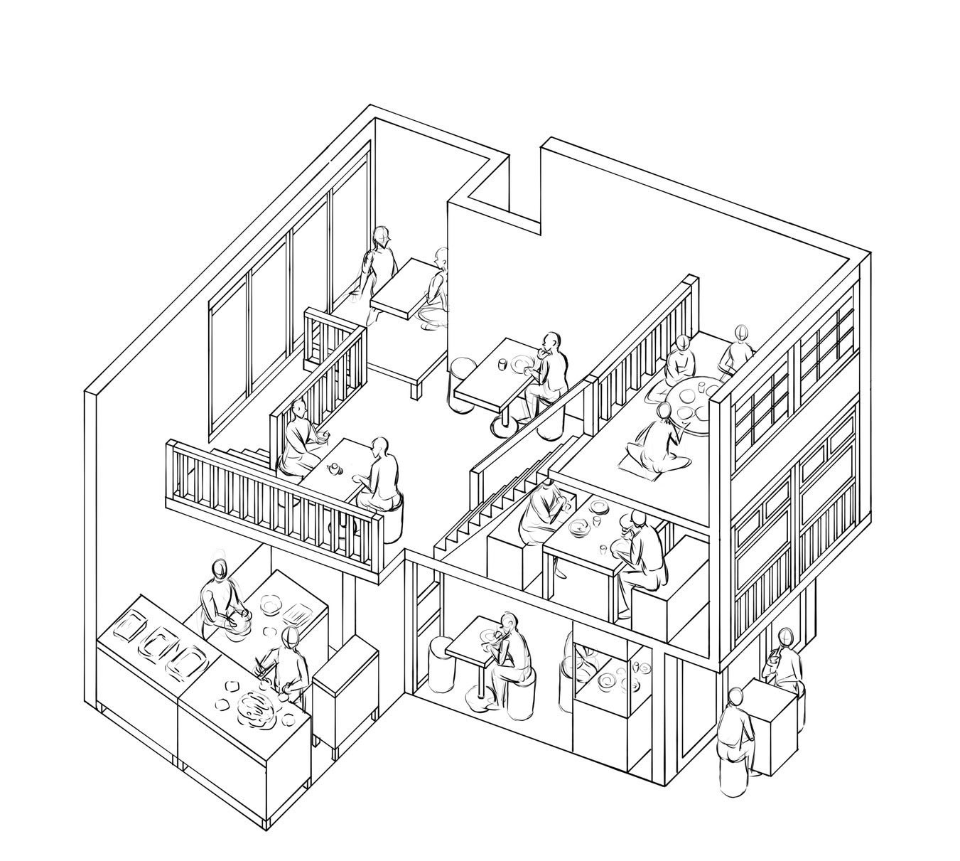 レストラン、ギャラリー、茶室など、銭湯にとどまらず幅広い建物の図解を制作。