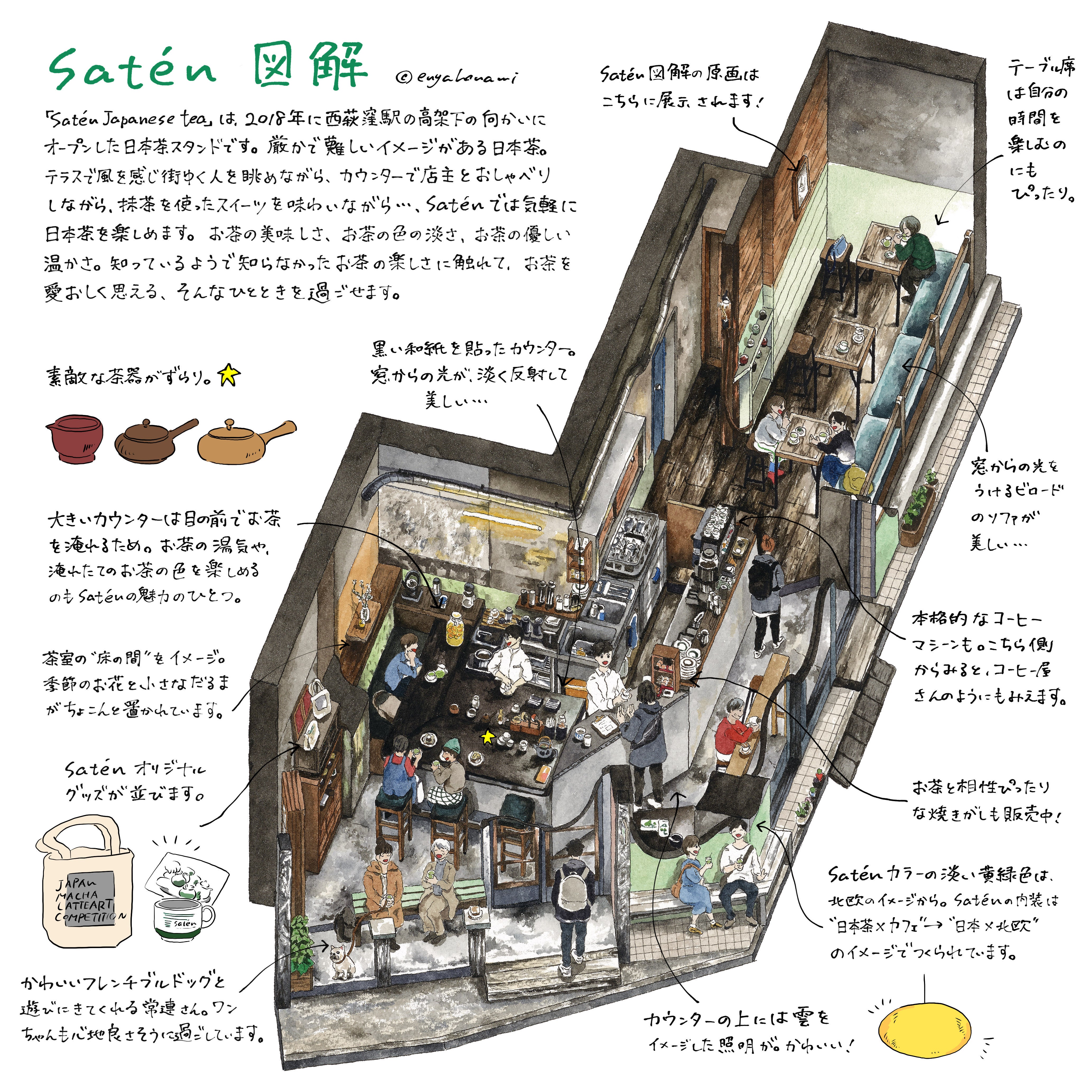 お店の姿を私達のイメージにあうような作品にするに当たって、画家の塩谷歩波さんにお願いしたいというアイデアは早い段階で思いつきました。それは個人的に作品のファンであったことと、塩谷さん本人が当店のランチ営業に度々いらしていることをスタッフから聞いていたことが理由です。あの精緻でありながら、作品を眺めていると自然に笑顔になってしまうような暖かいタッチで私達の店を描いてもらえたらと想像するとワクワクしました。写真や映像で残すのももちろんいいけど、お店の空気感や温度が伝わるものを作るには塩谷さんにお願いするのがベストだという強い確信がありました。