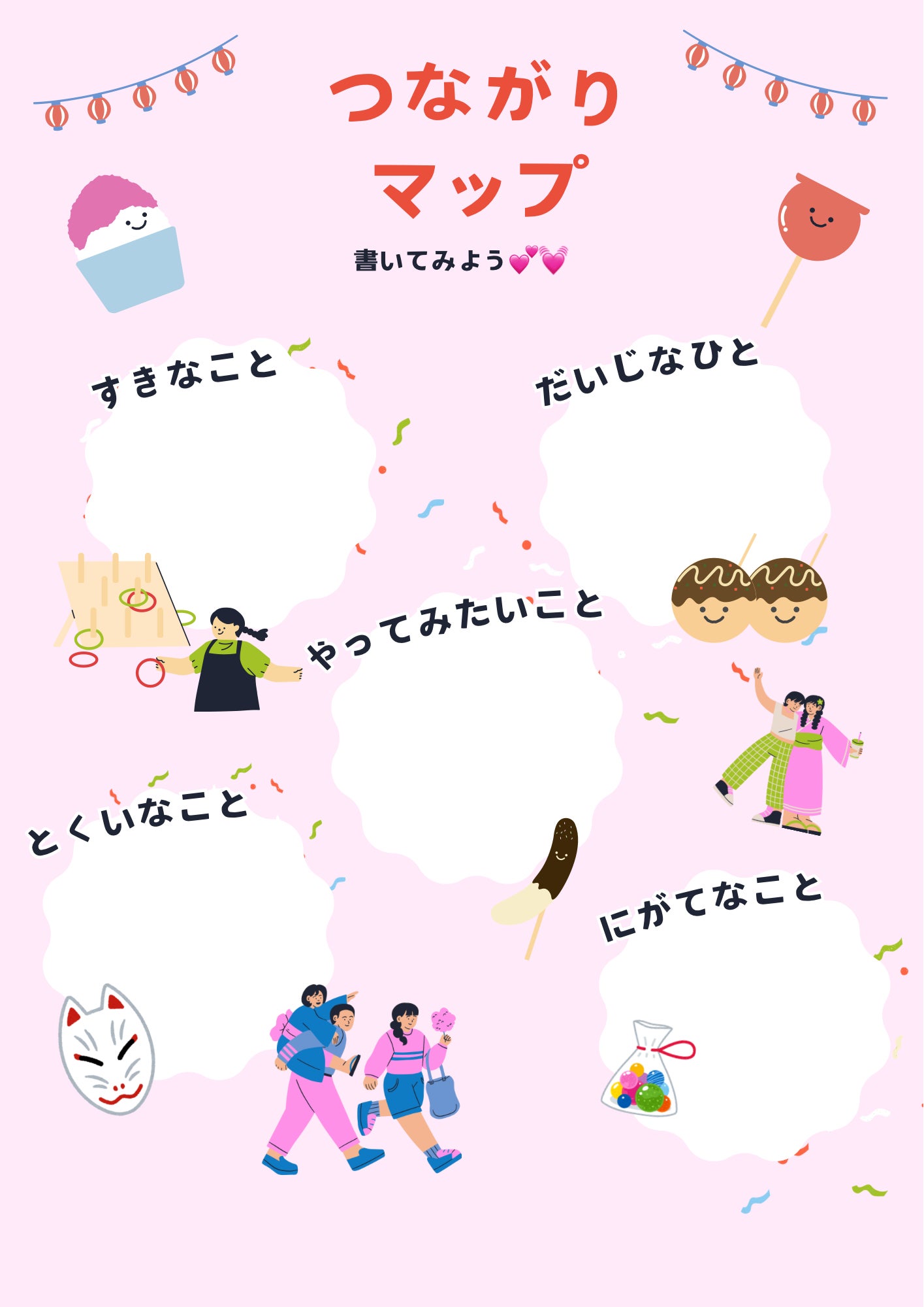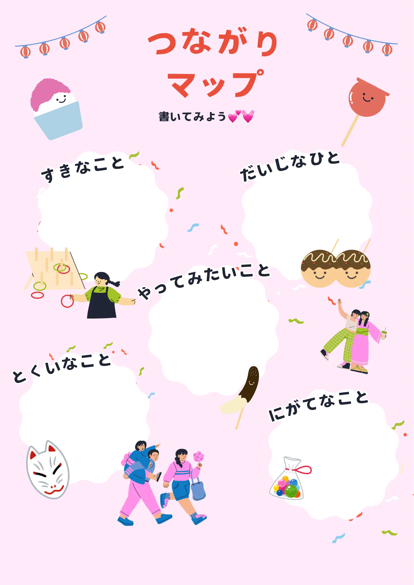 ① 自己紹介&アイスブレイク・みんなで一言ずつ自己紹介・軽いゲームやお絵描きなどをして緊張をほぐす→ 目的:お互いの距離を近づけ、リラックスして話せる雰囲気をつくる