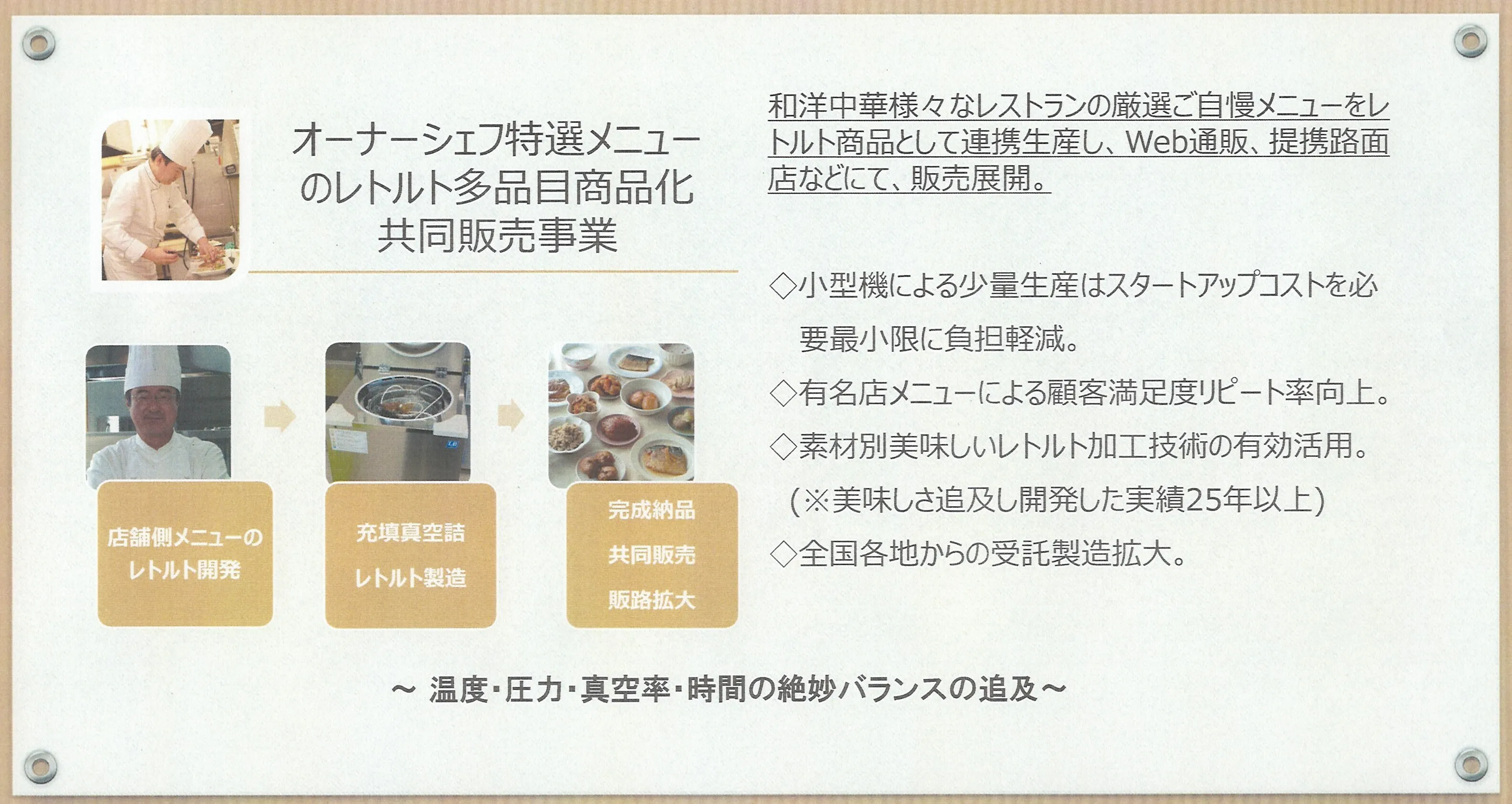 食品事業に携わり40年以上、レトルト食品生産の開発実績は多数。料理人として、経営として、チームと一緒に歩む現場主義をモットーに、食品事業コンサルタントとして二十数年間活動して来ました。5年前に銚子市内の飲食事業者からの切なる依頼で、応援すべく決心し家族で移住。例えば定食屋さんが惣菜業レトルト食品製造業などを並行して運営できる効果的経営として複合型の食品事業化を提唱し実践し歩んで来ました。平成23年の東日本大震災の経験を持ち、被災地支援活動に奮闘する中で「美味しいレトルト食品」の重要性を更に深め、今日まで様々な商品の開発とリリースを続けて来ました。コロナ禍のとてつもない厳しく過酷なる環境下、複合型事業を軸として乗り越えて来ました。一緒に頑張るチームスタッフさん8名ほどの小さな会社です。現在年商は約6~7,000万円規模ですが、更なる成長を目指して頑張っています。