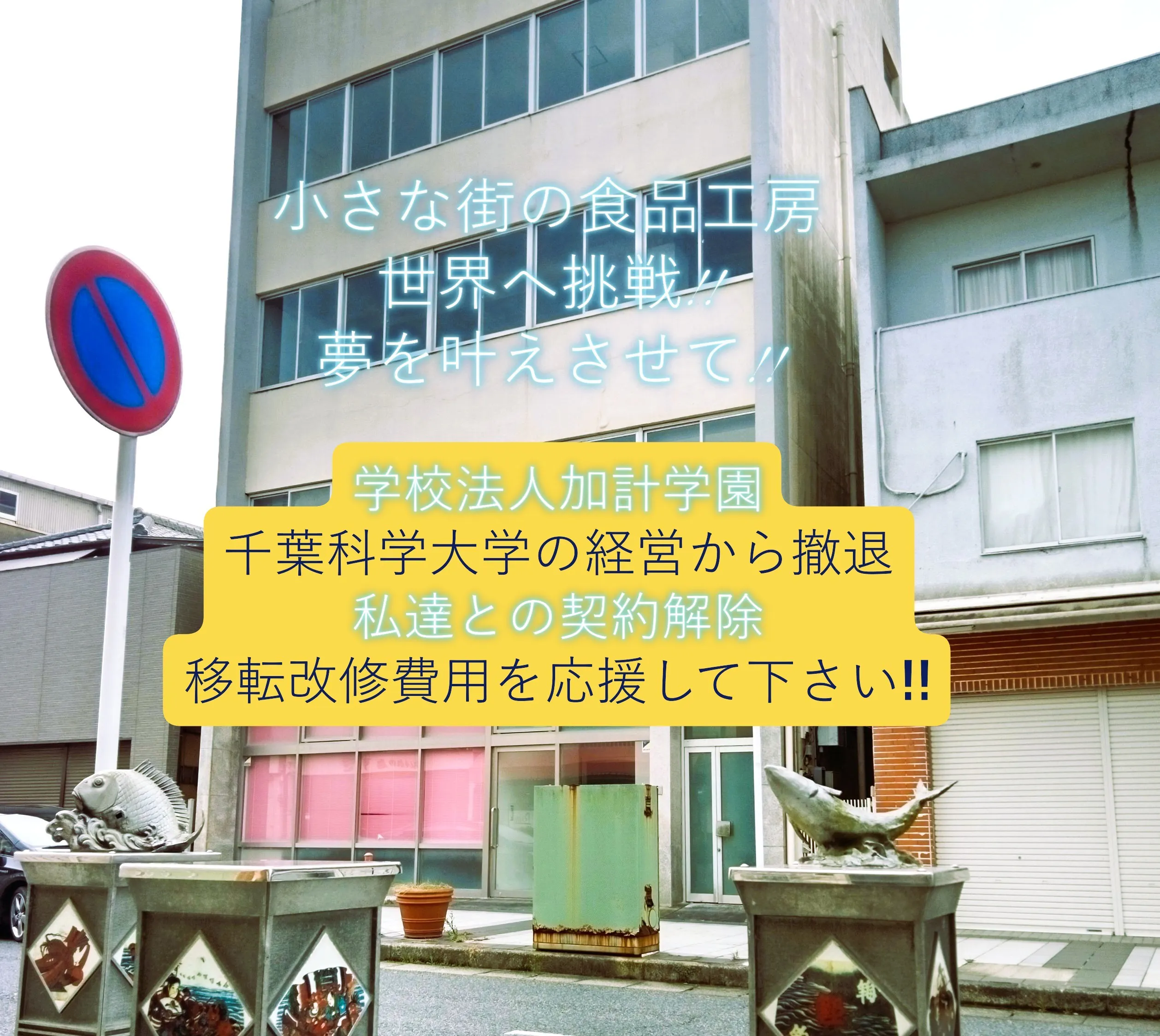 千葉県銚子市のある千葉科学大学の経営から学校法人加計学園(岡山県)が撤退し,新たに学校法人大城学園(沖縄県)継承するも、我々のとの運営契約は解除となり、継承しない通告を受けました。どうしても全面移転がしなければなりません。この数年の厳しい経営環境下、コロナ禍も頑張り続けて来ました。複合型食品事業者としてがばり続け、発展向けた道のりを叶える為には、どうしても全移転という過酷なる究極のこの局面を乗り越えねばなりません。幸運にも恵まれ移転先は整えました。ですが本来必要とする改修工事費が足りません。日本の田舎から世界へと発信出来る事業体形を目指して来ましたが、このままでは夢は途絶えてしまいます。何とか移転先改修費用を整え、市街地中心に復帰して地域の愛されるお店として、また加工食品事業者としての道を極め、美味しいメニューから織りなす多品目のレトルトおかずを国内各地へ海外へと販路拡大し、強い事業経営基盤を確立して参ります。そして、後世に受け継がれる素敵な「襷」事業として発展させます。