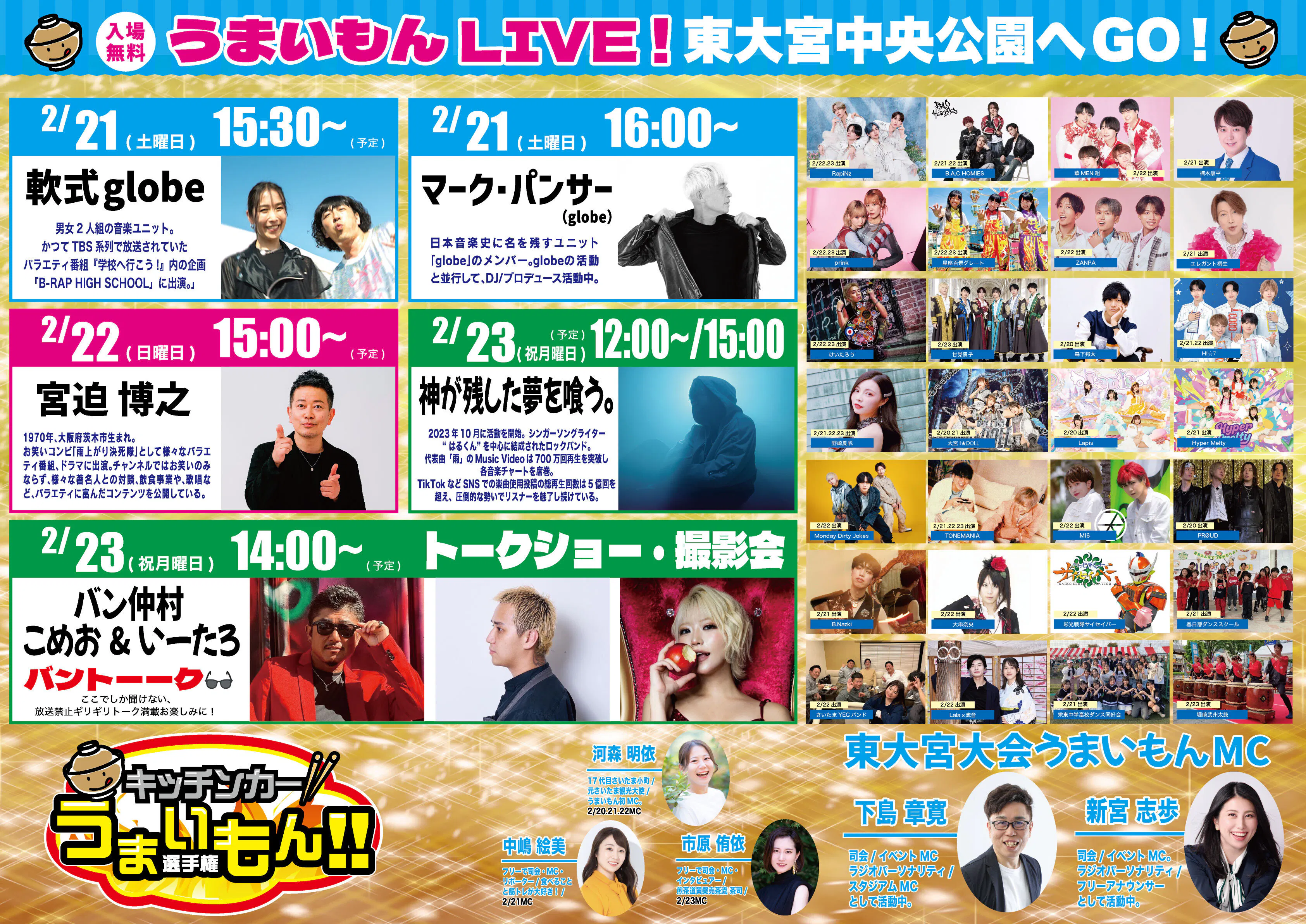 2026/01/21 10:002月20日~23日 東大宮中央公園で開催予定の「キッチンカーうまいもん選手権 東大宮大会」。ステージイベント日程がぞくぞくと決定しています。画像は配布チラシとなっております。ggお家族・お友達またはお一人でも遊びに来てください。 もっと見る