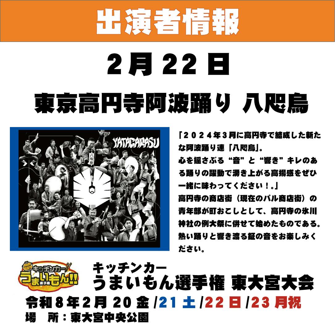 「2024年3月に高円寺で結成した 新たな阿波踊り連「八咫烏」 心を揺さぶる“音”と“響き” キレのある踊りの躍動で湧き上がる高揚感を ぜひ一緒に味わってください! 会場の皆さん、応援よろしくお願いいたします。」 高円寺の商店街(現在のパル商店街)の青年部が町おこしとして、高円寺の氷川神社の例大祭に併せて始めたものである。 当初は隣町の阿佐谷七夕祭りに対抗して夏のイベント用に阿波踊りに似た「高円寺ばか踊り」として開始され、やがて都内在住の徳島県出身者から指導を受ける形で「阿波おどり」として発展した。 熱い踊りと響き渡る鉦の音をお楽しみください 出演は2/22予定。 出演時間など1月下旬に発表。。