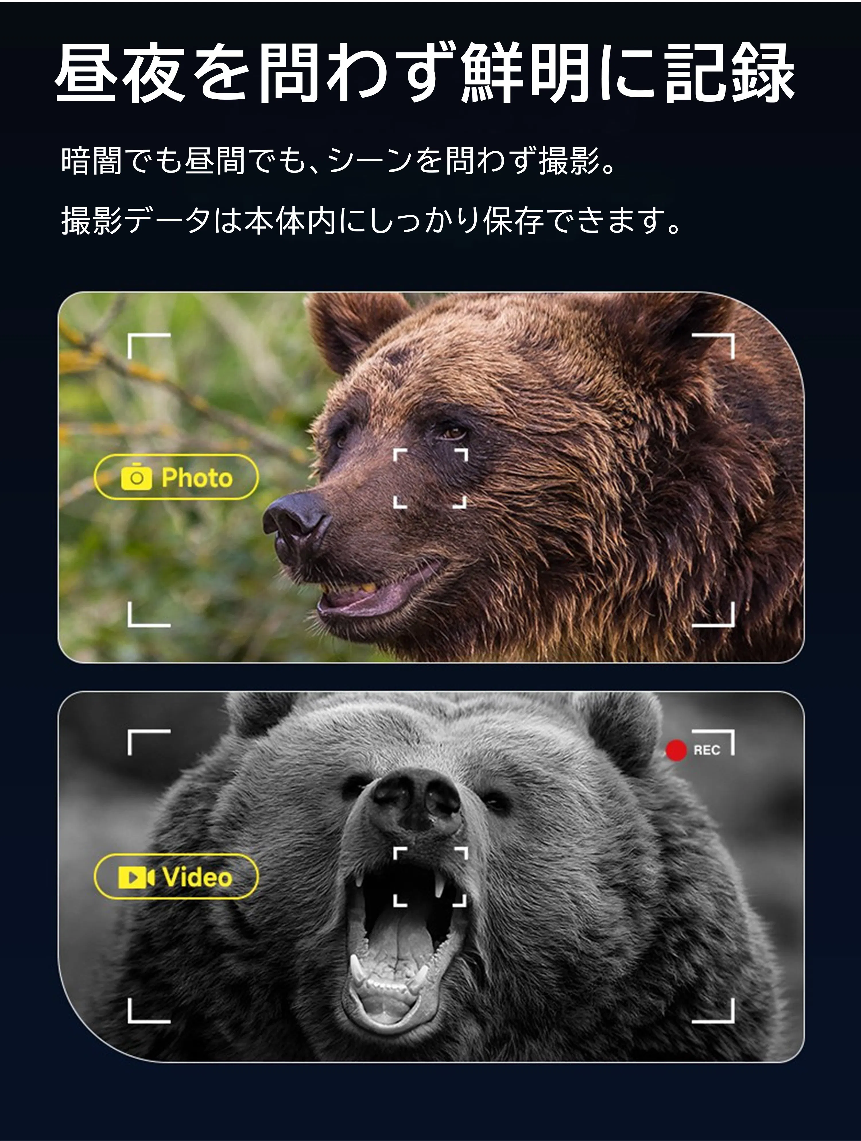 従来のナイトビジョンでは見えなかった暗所の被写体も、高感度CMOSセンサーと赤外線補助光によって明確に映し出します。
