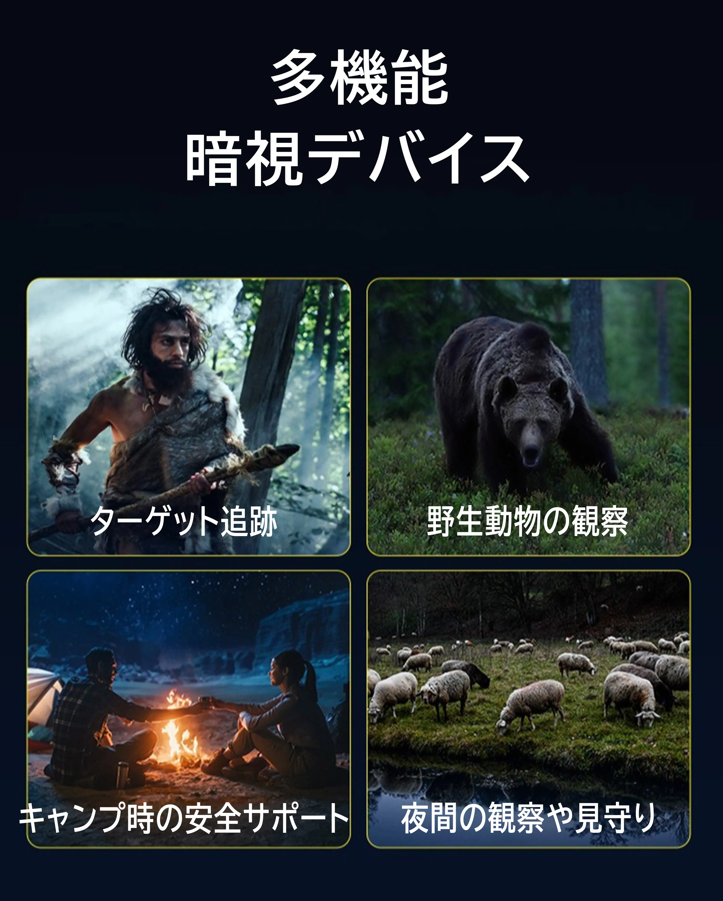 A. キャンプ・登山・夜間観察・警備・牧場見守りなど、アウトドアから防犯用途まで幅広く活用できます。