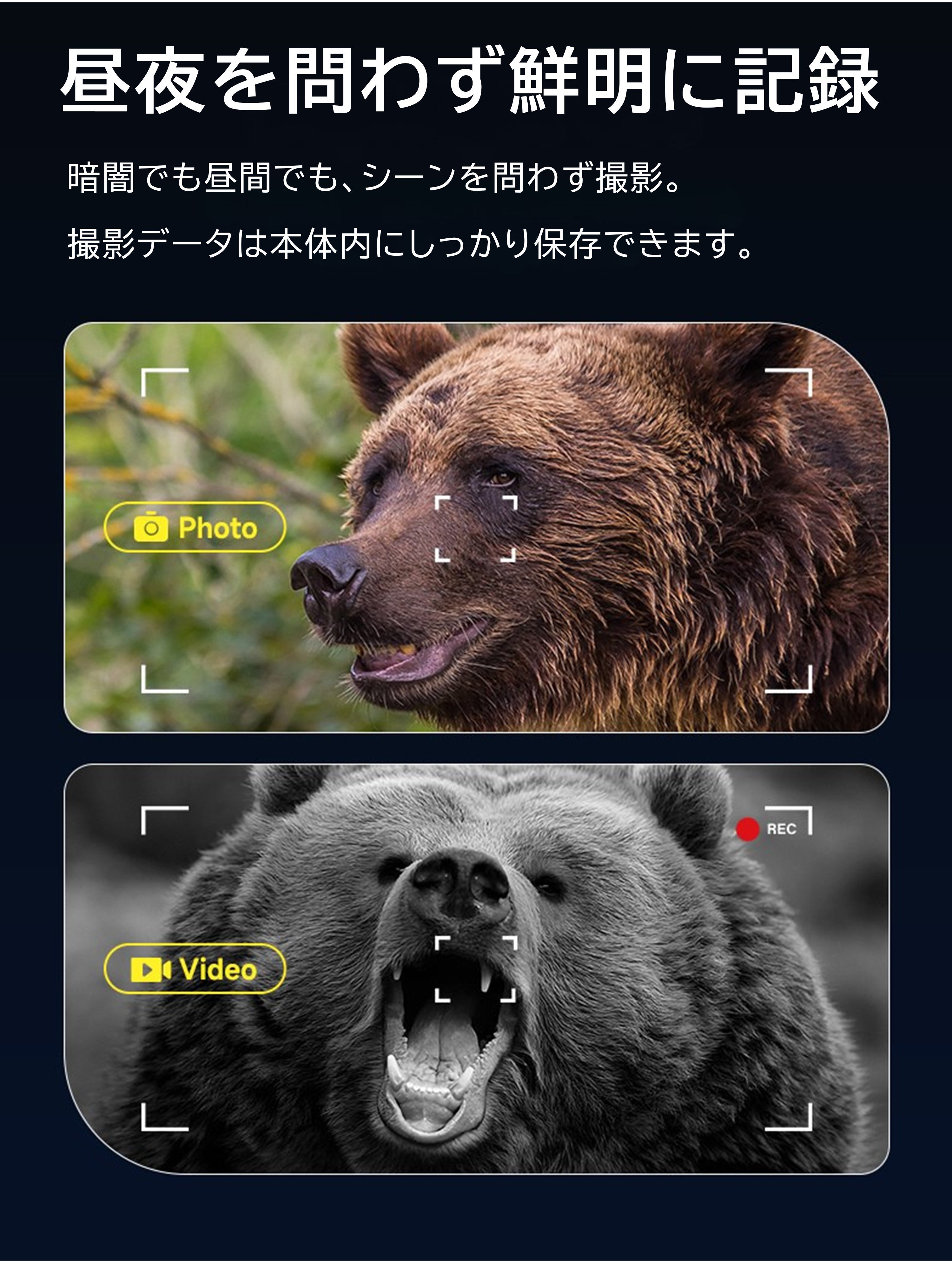 従来のナイトビジョンでは見えなかった暗所の被写体も、高感度CMOSセンサーと赤外線補助光によって明確に映し出します。
