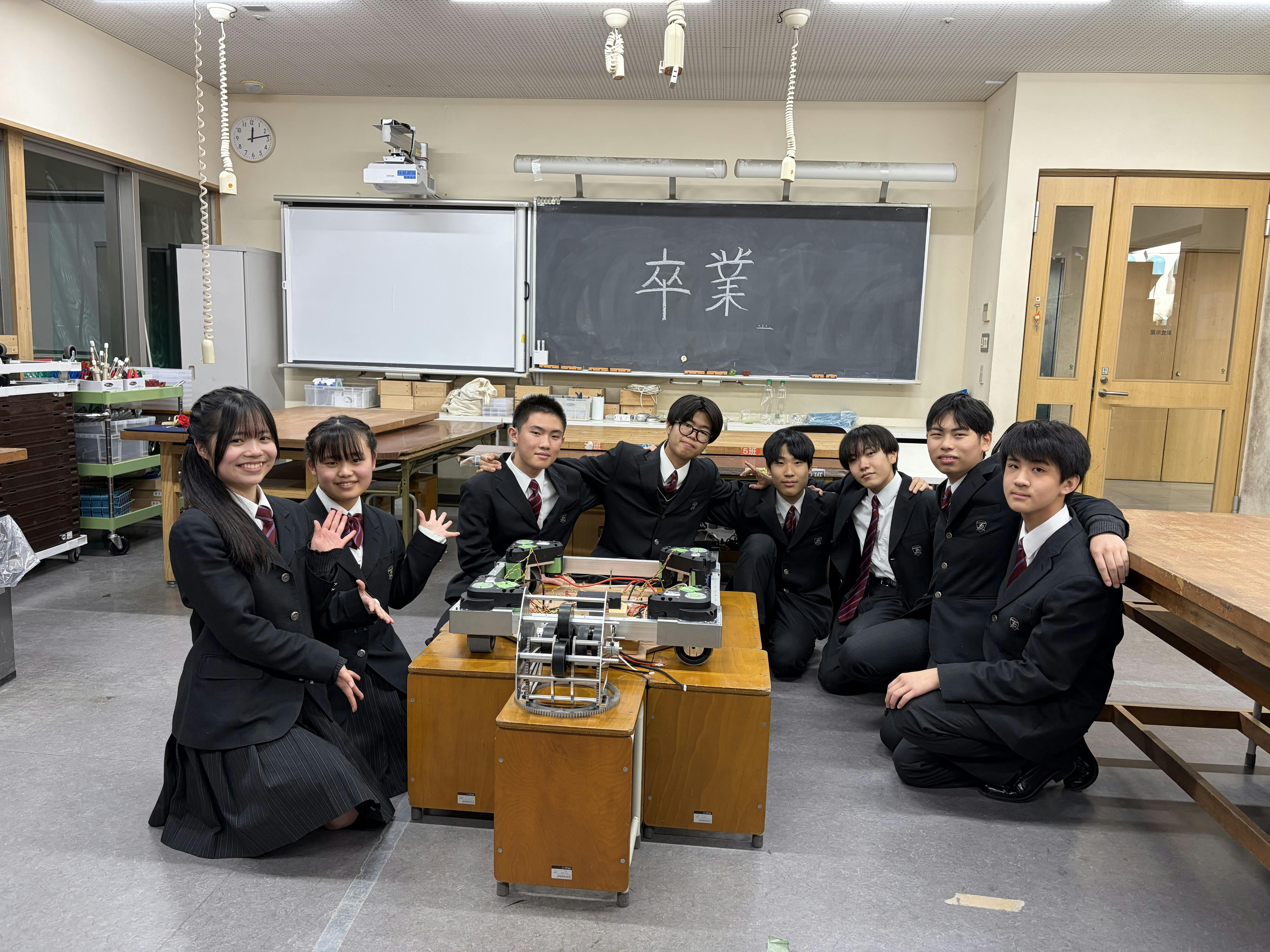 卒業式後、普段ZENSHINの活動拠点となっている技術室では、卒業生たちがこれまで共に作り上げてきたロボットを囲みながら、記念撮影を行っていました。