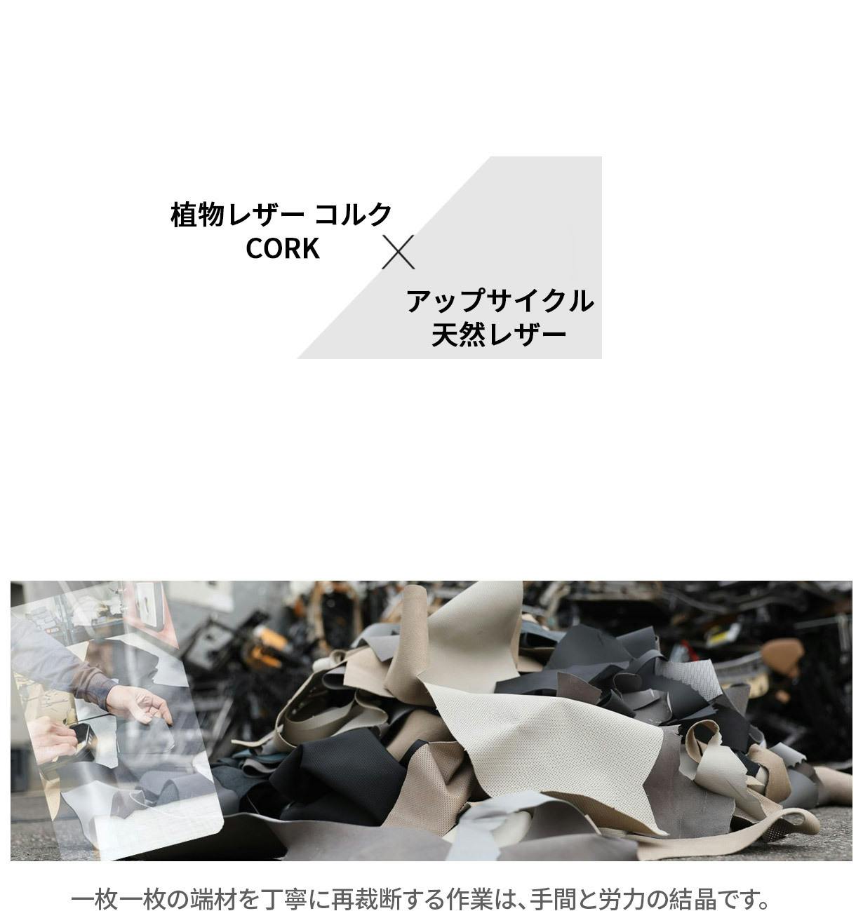 天然レザーの上品さとコルクの柔らかな質感を一度に楽しめる、ハイブリッドデザイン。