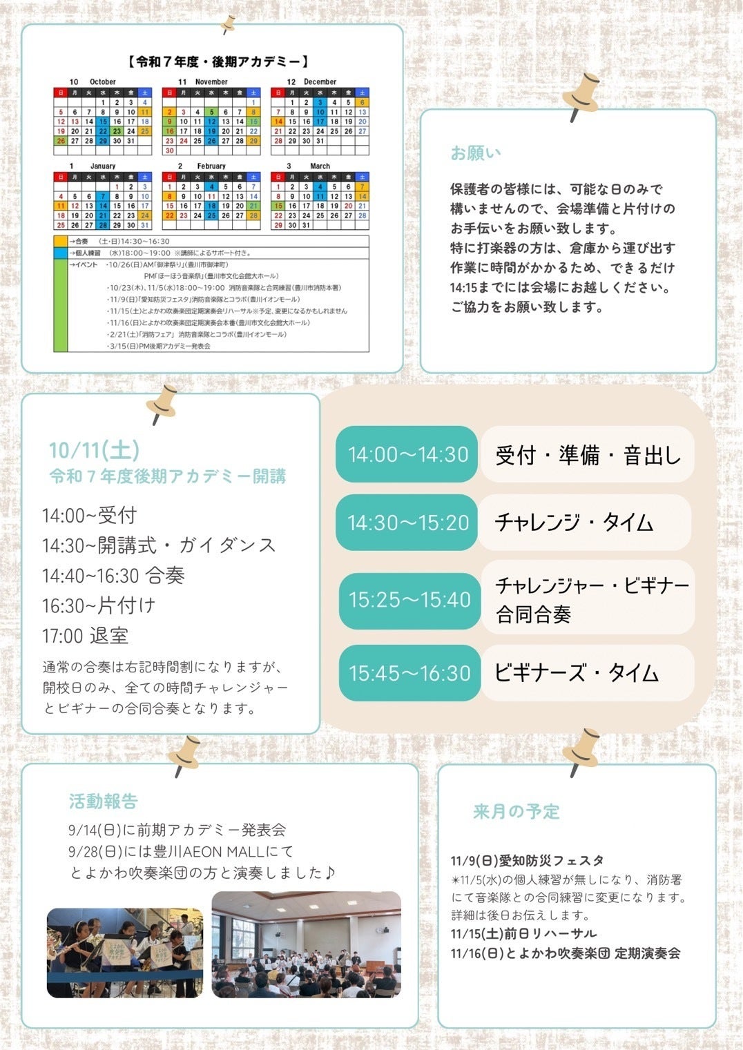 豊川市内で開催するほーほう音楽祭、ショッピング・モールでのイベントなどに出演、11月はとよかわ吹奏楽団の定期演奏会に出演予定。