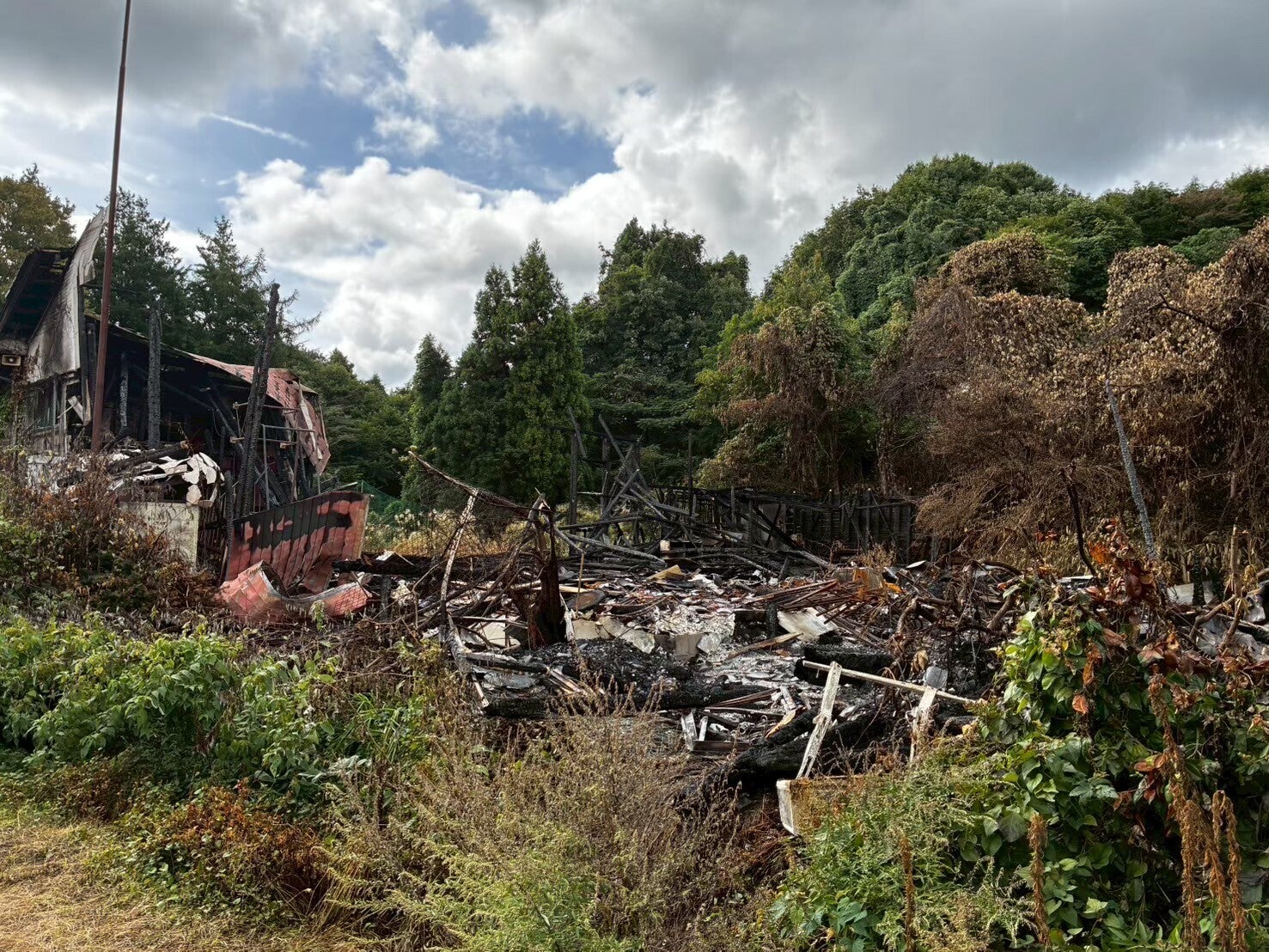 火災は想像を超える火力で全て焼き尽くします。雨が降る中でも窓ガラスが溶け瓦に付着し、燃えた建物から離れた場所のブルーシートが溶けるほどです。金属で出来た刃物もぐにゃぐにゃに曲がっていました。