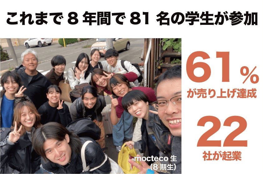 これまで8年で学生81名が参加し22名が起業した創業支援プログラム「mocteco(モクテコ)」。自分が本当にやりたいことを社会で試す3ヵ月間。北海道に限らず、このプログラムを経て全国各地に挑戦が広がっています。これからもこの事業を続け挑戦を生み続けていきたい。