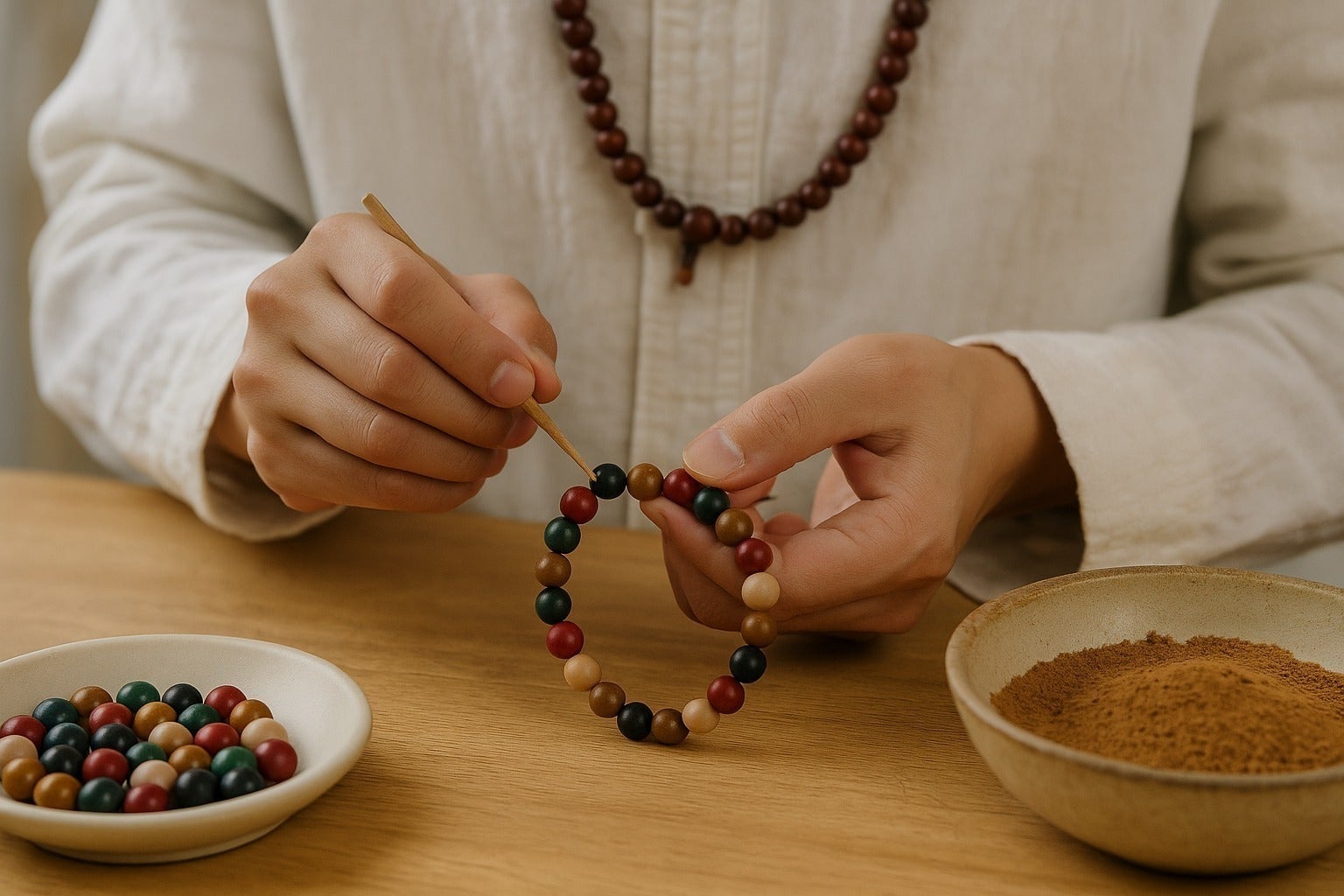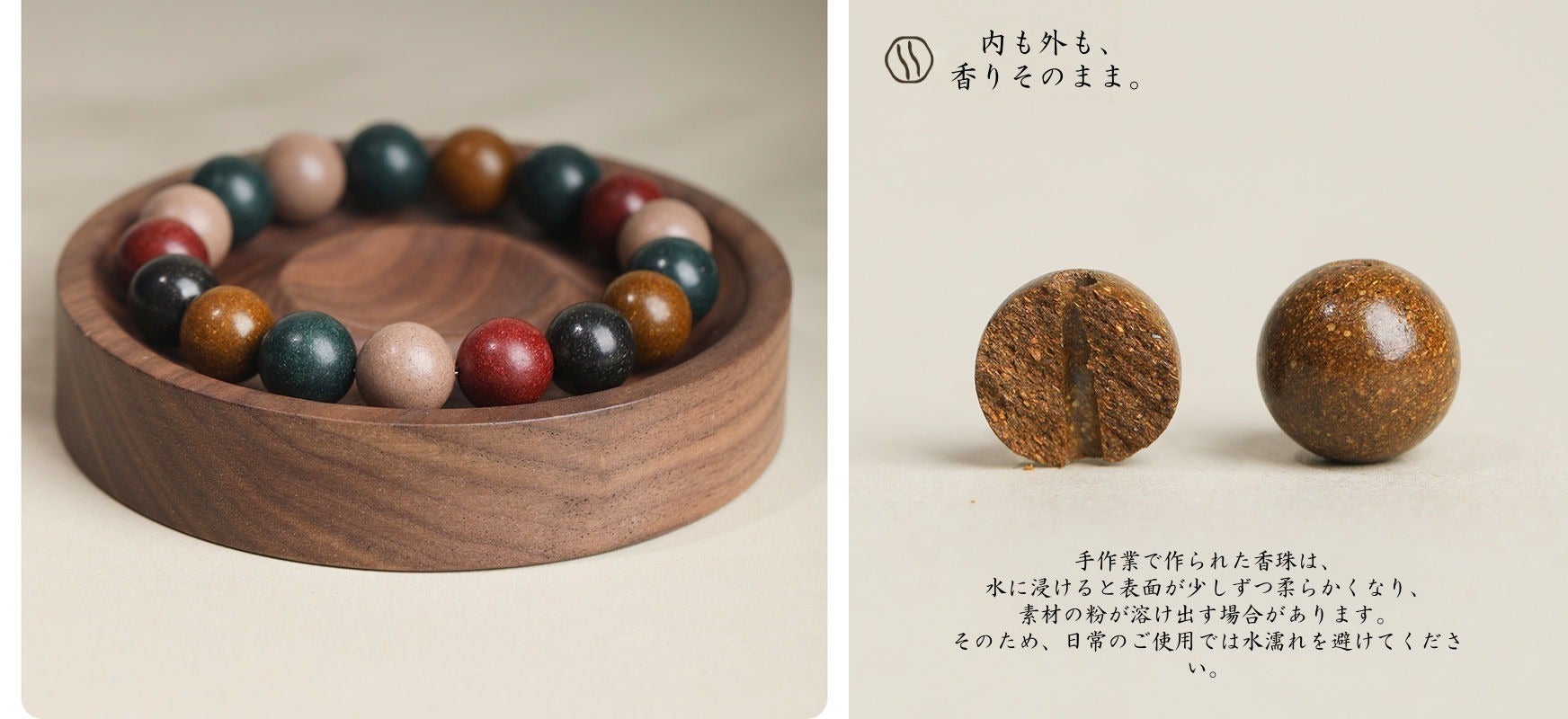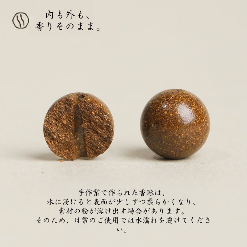 香珠には、香木・天然樹脂・ハーブ粉末など、自然由来の素材を使用しています。強い香りではなく、ふとした瞬間に感じられるほどの穏やかな香りが特徴です。