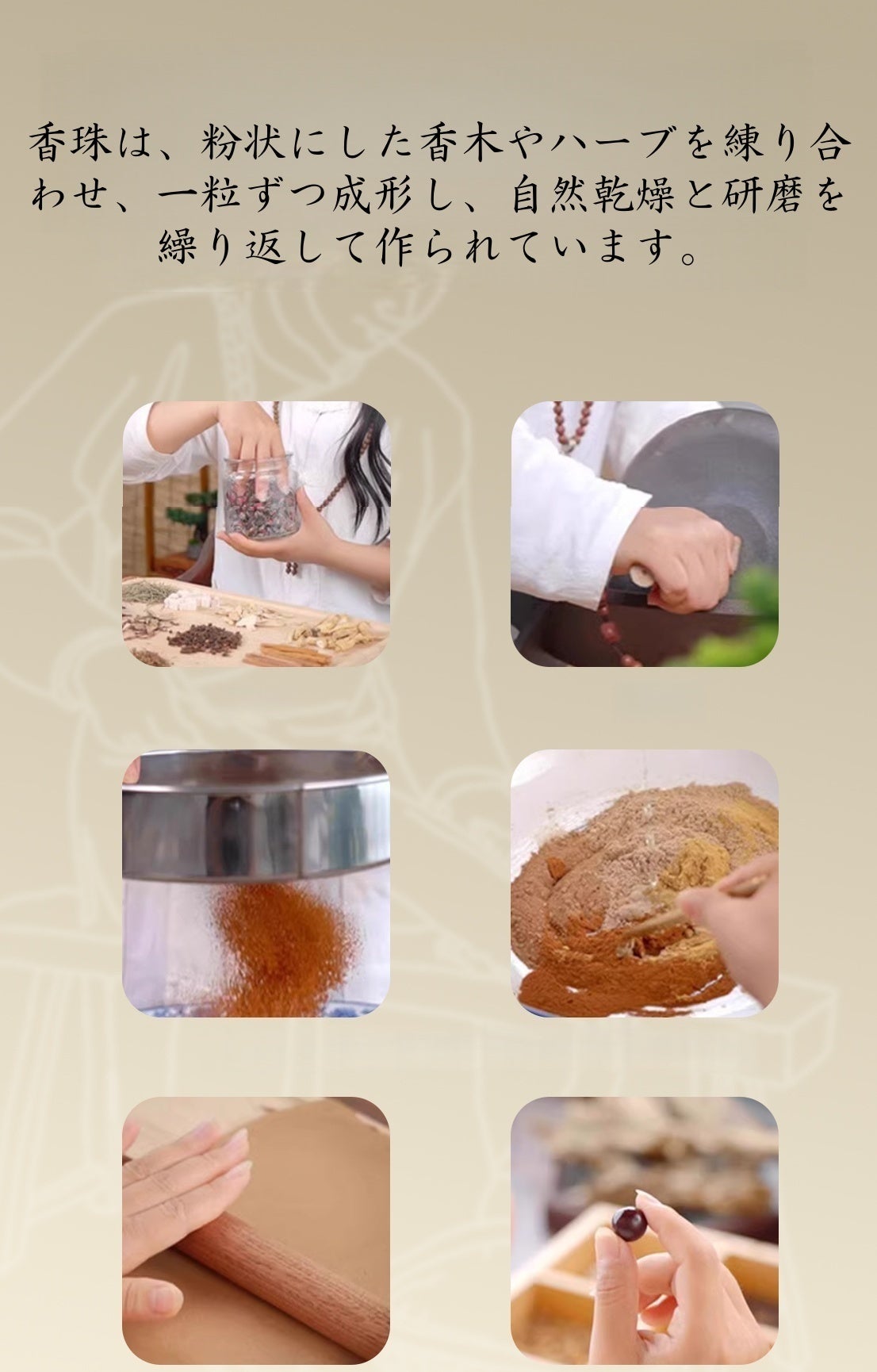 | 🌿 手作業による伝統製法 | 香木・ハーブ素材を粉末にし、職人が一粒ずつ手で練り上げ |