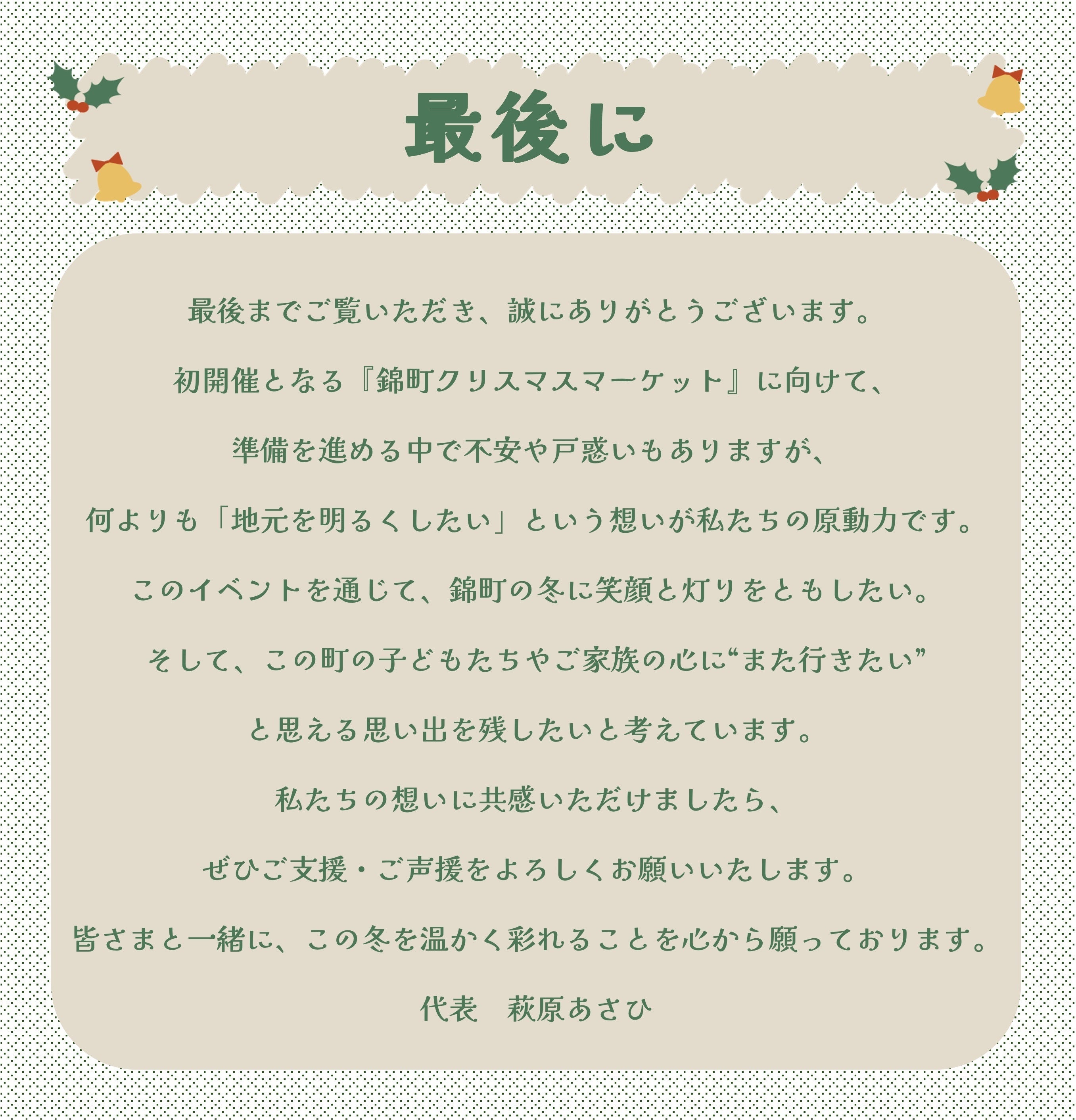 2025/12/12 17:45この度は、本プロジェクトにご支援・ご声援をお寄せいただき、誠にありがとうございました。皆さまからいただいたご支援のおかげで、無事にイベントを開催し、終えることができました。ご支援という形だけでなく、応援コメントやSNSでのシェア、周囲の方へのご紹介など、さまざまなかたちでお力添えをいただいたことに、心より感謝申し上げます。当日は、来場された皆さまの表情や会場の空気感から、このプロジェクトに託していただいた期待の大きさを改めて実感いたしました。また、出店者や関係者の方々からも、「こうした取り組みが地域にとって大きな一歩になる」といったお声を頂戴し、支援者の皆さまとご一緒にこの場をつくり上げられたことを、何よりうれしく思っております。皆さまからお預かりしたご支援金は、事前にご案内しておりました通り、会場費・音響や照明等の機材費・装飾費・安全対策に関わる諸経費など、イベント運営に必要な費用として大切に活用させていただきました。いただいたご支援を無駄にすることのないよう、一つひとつの判断において「支援してくださった方々に胸を張れるかどうか」を意識しながら準備を進めてまいりました。本プロジェクトは、イベントの開催をもって一区切りとなりますが、ここで得られたご縁や学びを、今後の活動に確実につなげていきたいと考えております。いただいたご支援や温かいお言葉の一つひとつが、次のチャレンジへ踏み出す大きな原動力になっています。改めまして、本プロジェクトに共感し、力をお貸しくださったすべての支援者の皆さまに、深く御礼申し上げます。今後の取り組みにつきましても、活動報告を通じて随時お伝えしてまいりますので、引き続き温かく見守っていただけましたら幸いです。本当にありがとうございました。錦町クリスマスマーケット代表 萩原 もっと見る