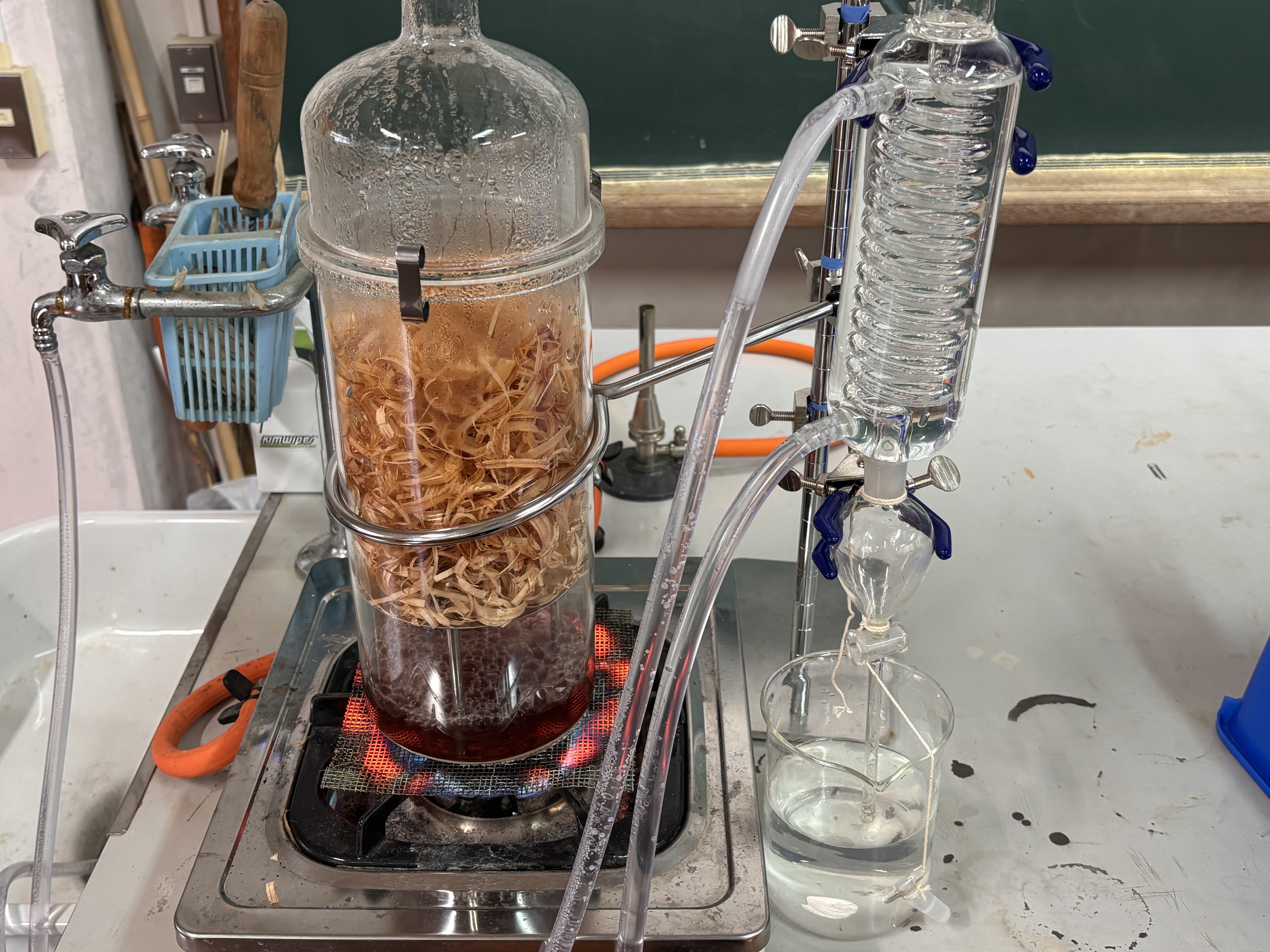 杉のかんなくずを蒸留し、蒸留水を抽出している